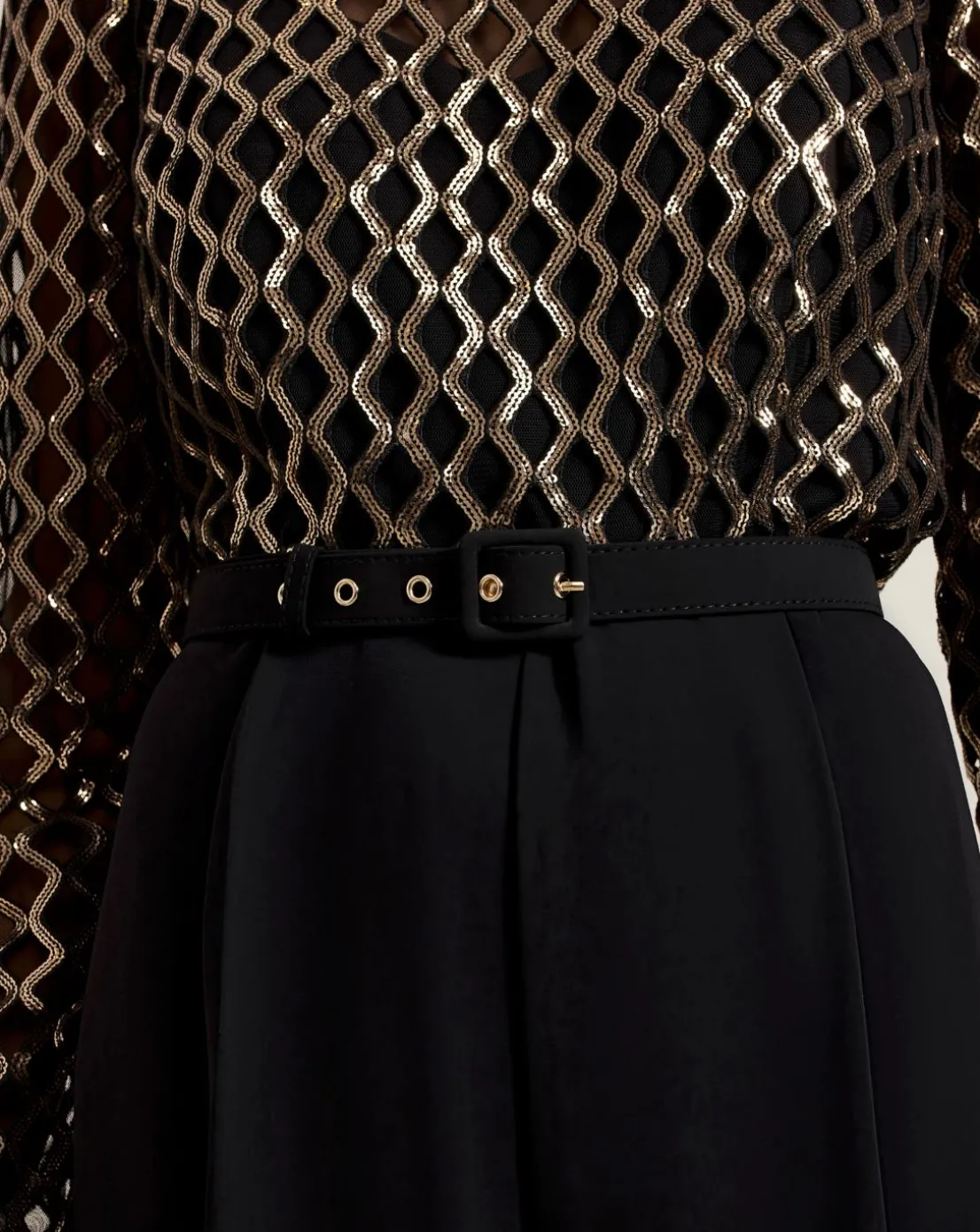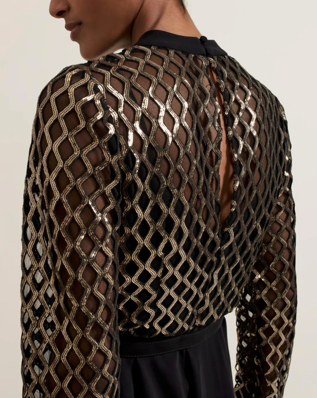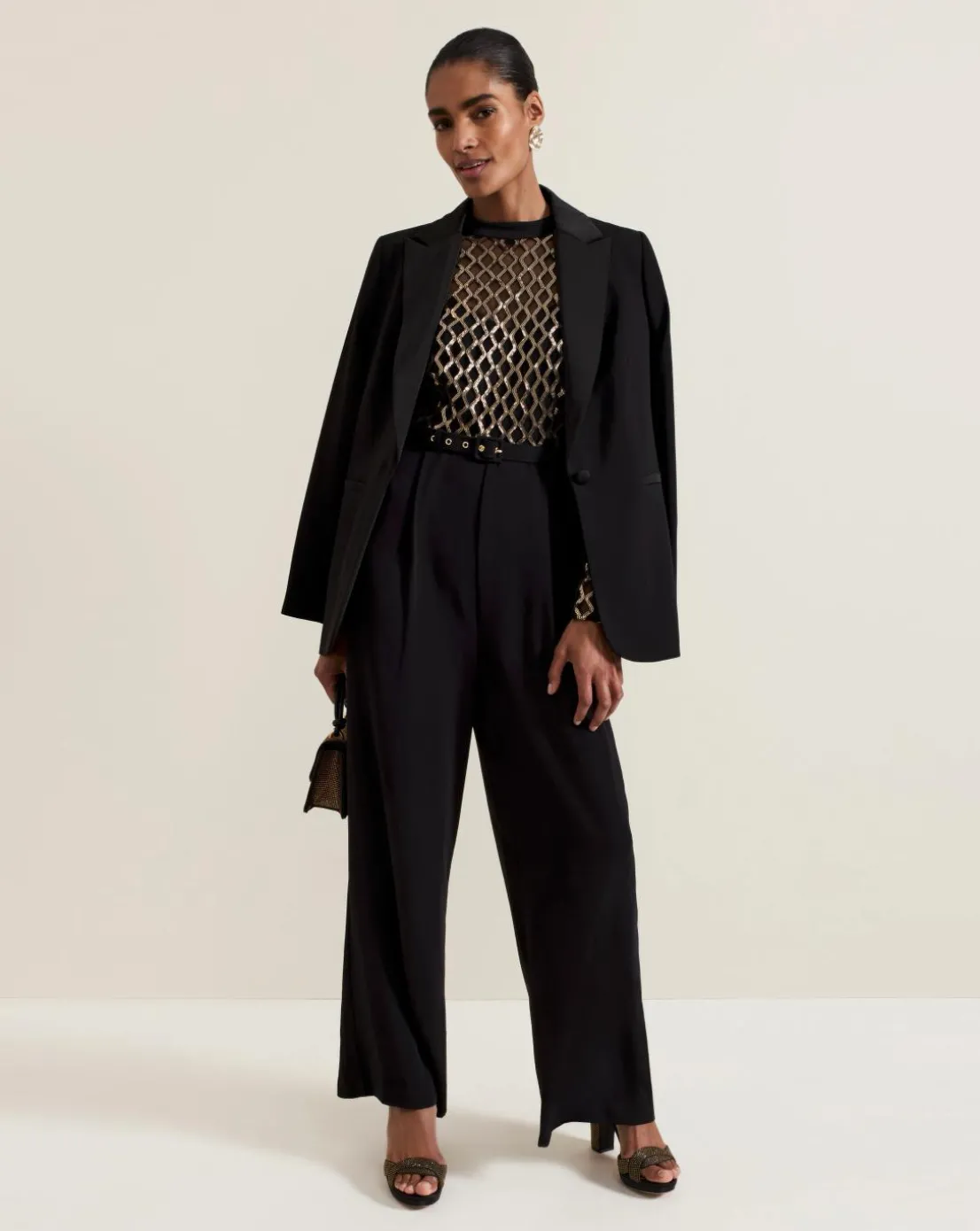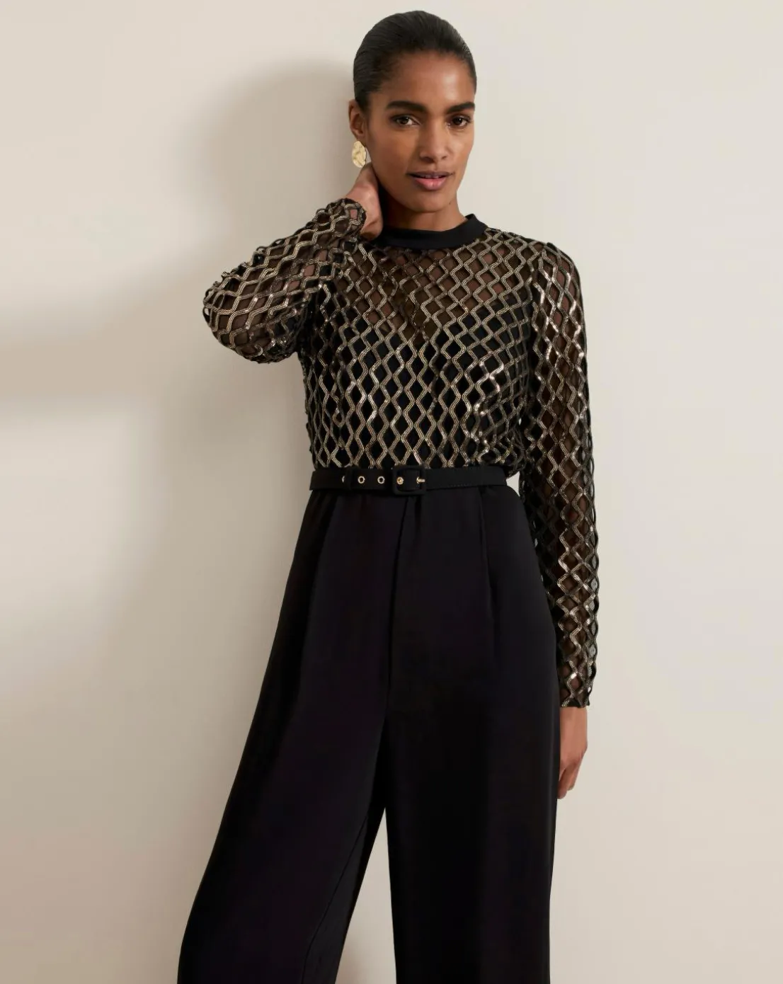 Meet your new favourite occasion jumpsuit. Designed with a black mesh top featuring a gold diamond print design our jumpsuit falls to a wide-leg black trouser. Considered details such as the matching black belt to highlight the waist and keyhole detail at the back elevate the style to create a sophisticated look for your next big event.This style is responsibly sourced. This style has been made from recycled polyester, giving materials that would have ended up in landfill a new lease of life.