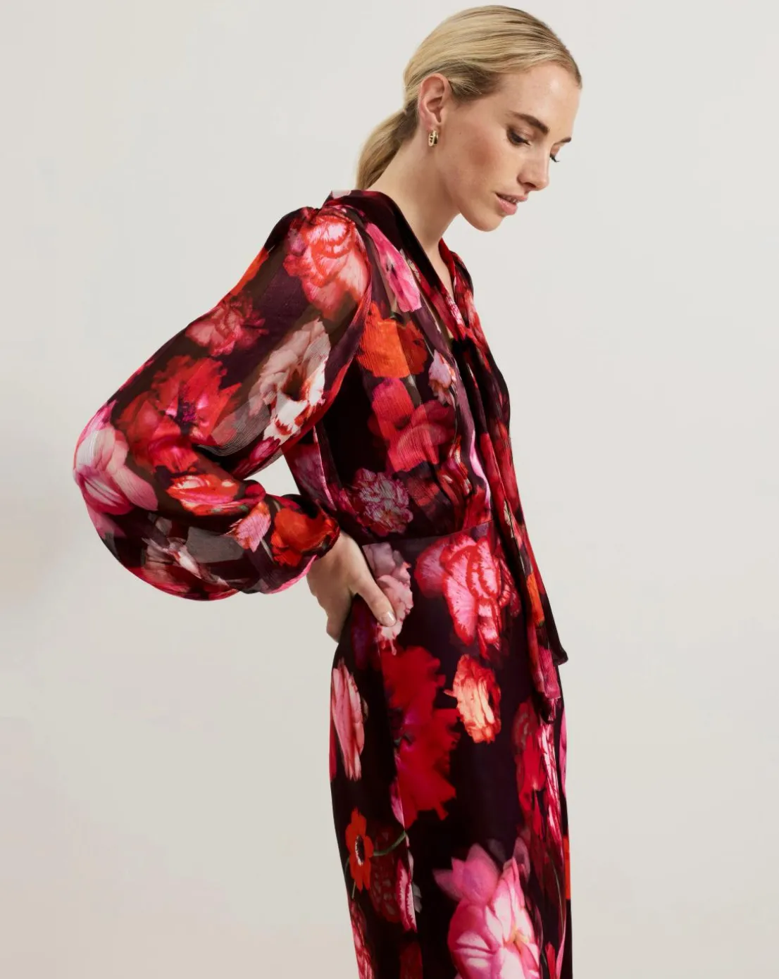 Feminine and sophisticated, our Eleni dress features a new eye-catching floral print, hand-pressed in our studio. Cinched cuffs create blouson sleeves for subtle volume, flowing through to a midi silhouette. The elegant tie detail at the neckline can be worn loose or as a pussybow for versatile styling. Style with heels for an event-ready look or dress down with your favourite boots.