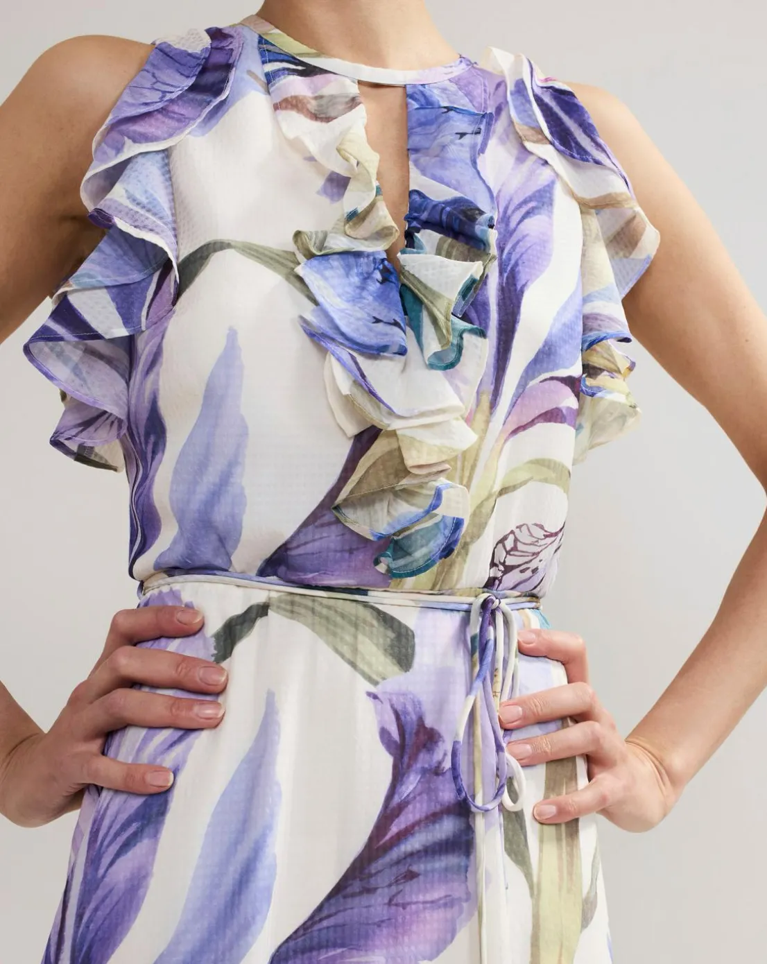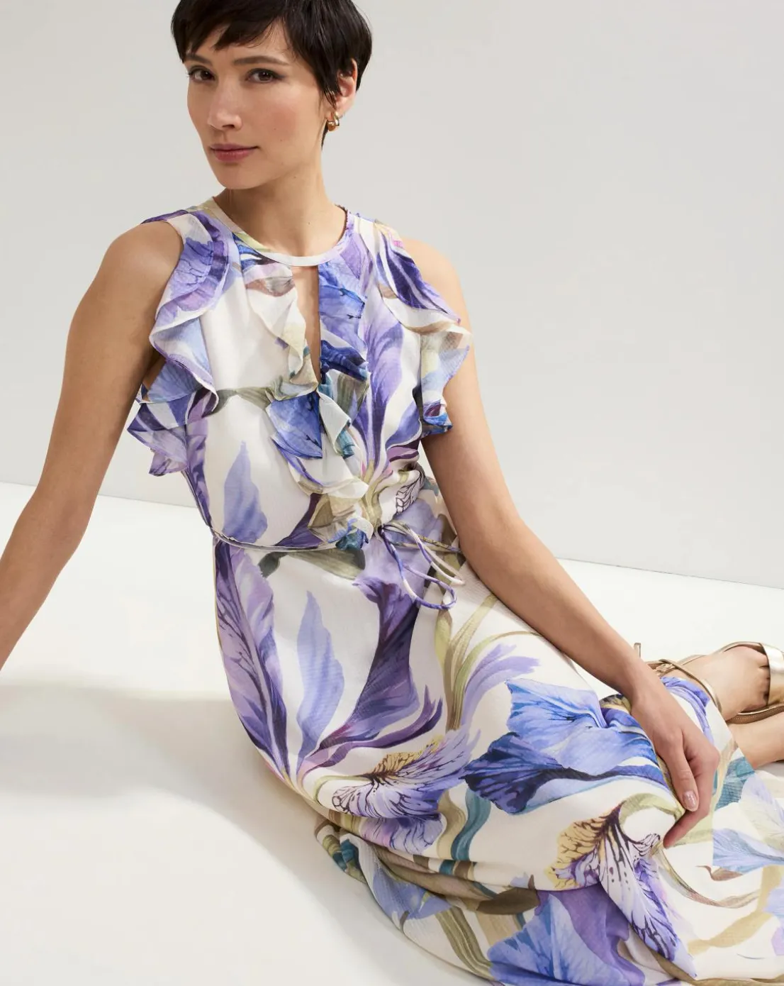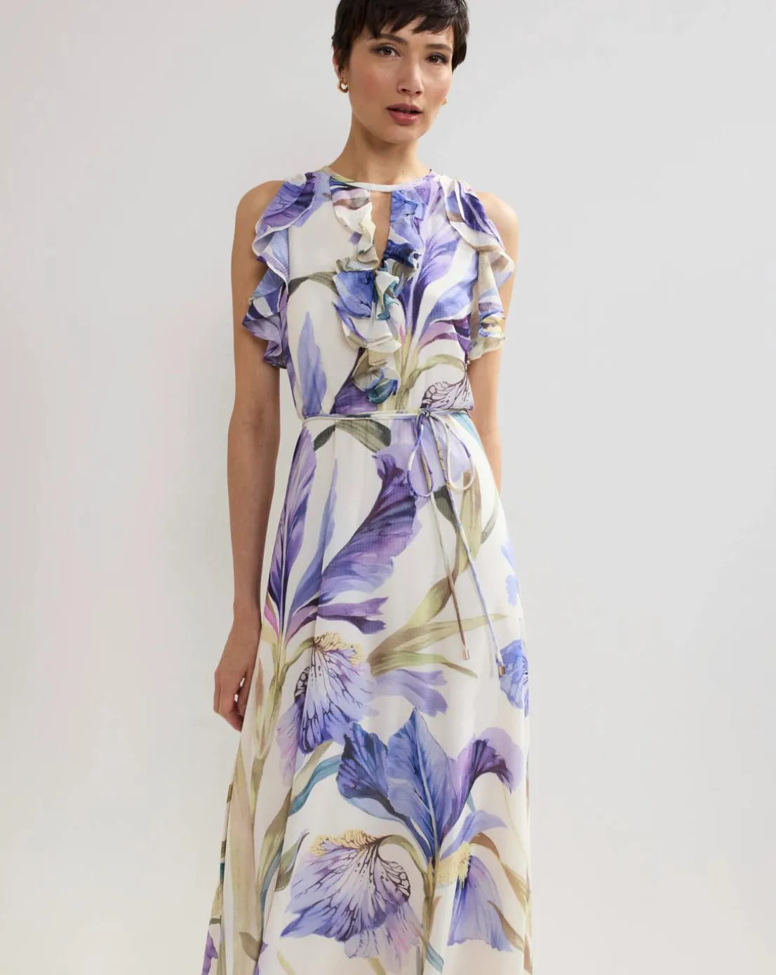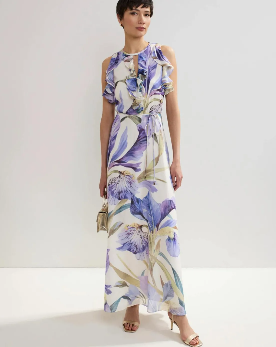 Beautiful spring florals decorate our Rachel dress, perfect for weddings and special occasions alike. The sleeveless shape is emphasised by feminine ruffle detailing, flowing through to a fluid maxi silhouette for beautiful movement. Style with matching gold accessories for an elevated event look you’ll turn to time and time again.