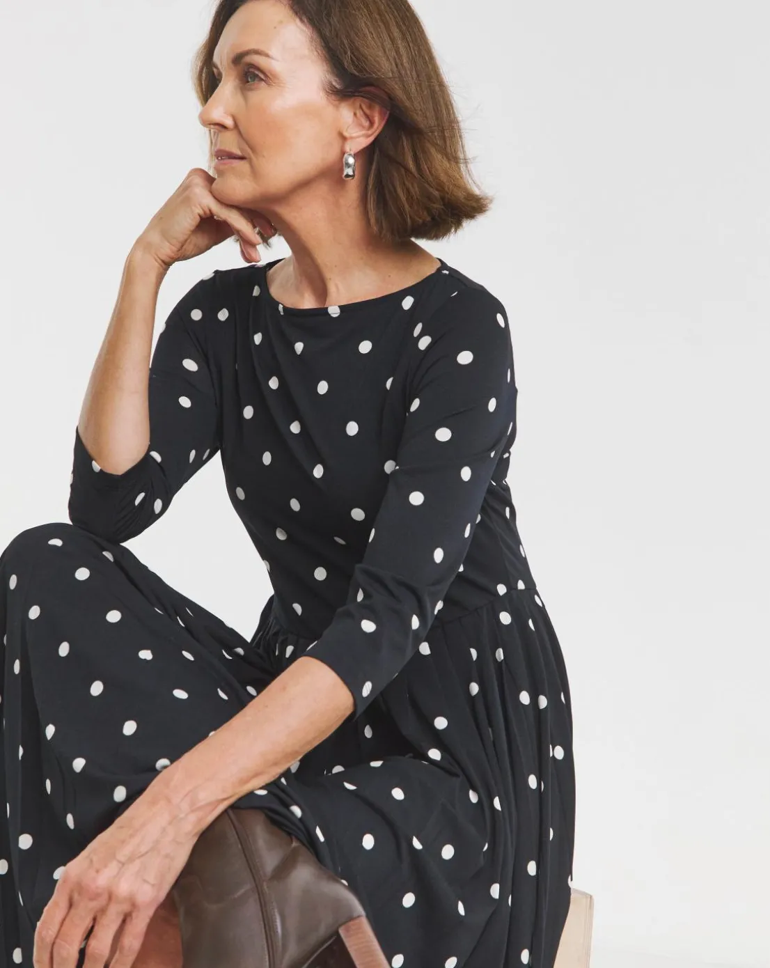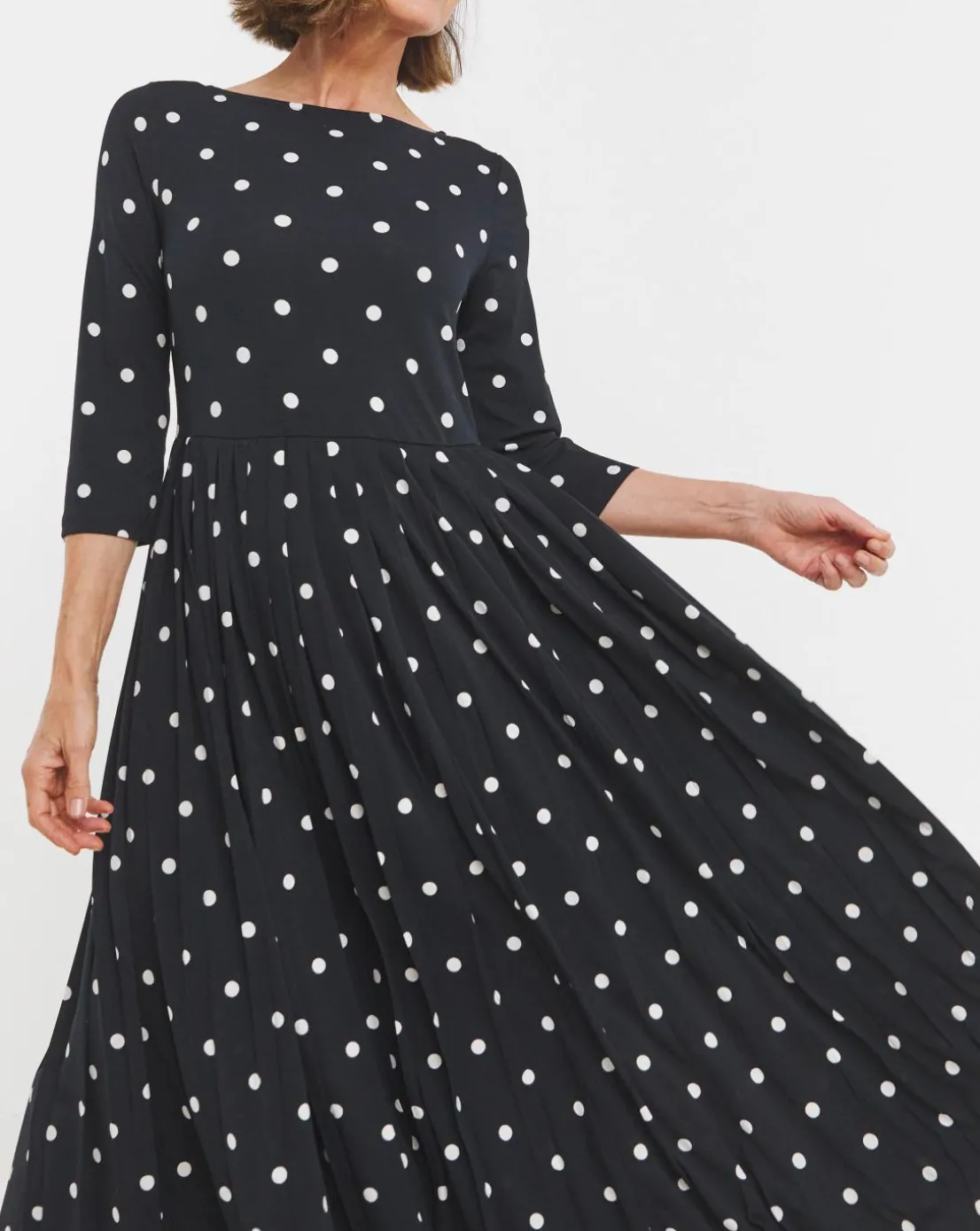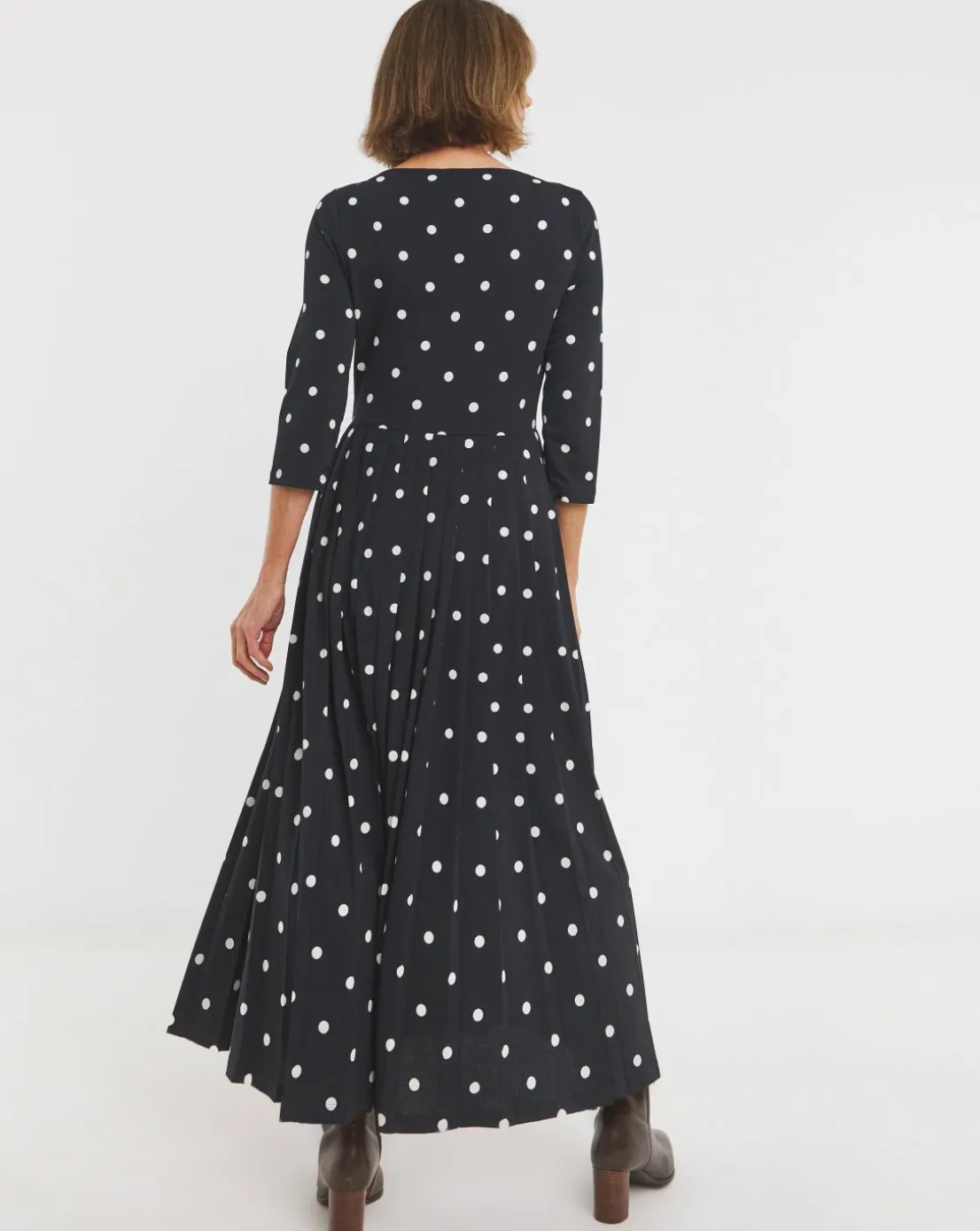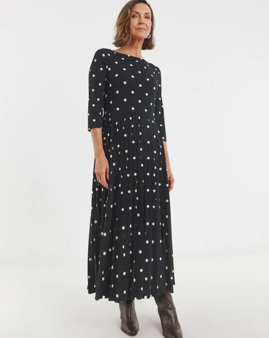 Wanting to add a staple item to your wardrobe this season then this navy spotted dress is the perfect go to for any occasion. Featuring, long sleeves, Slash neckline, Pleated skirt and a maxi length of 52 inches.