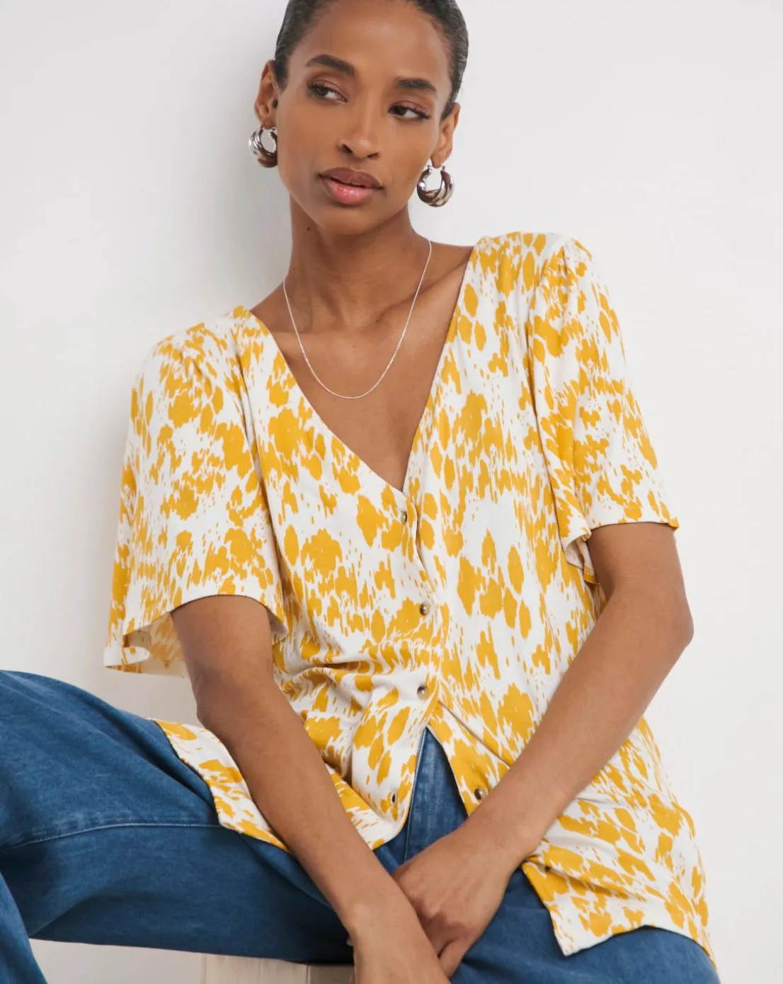 Our button front angel sleeve tops are a wardrobe essential. In a soft, stretchy jersey and longline shape, it’s a comfortable piece for every day. Pair this yellow print with jeans or shorts for a casual, summer time look.