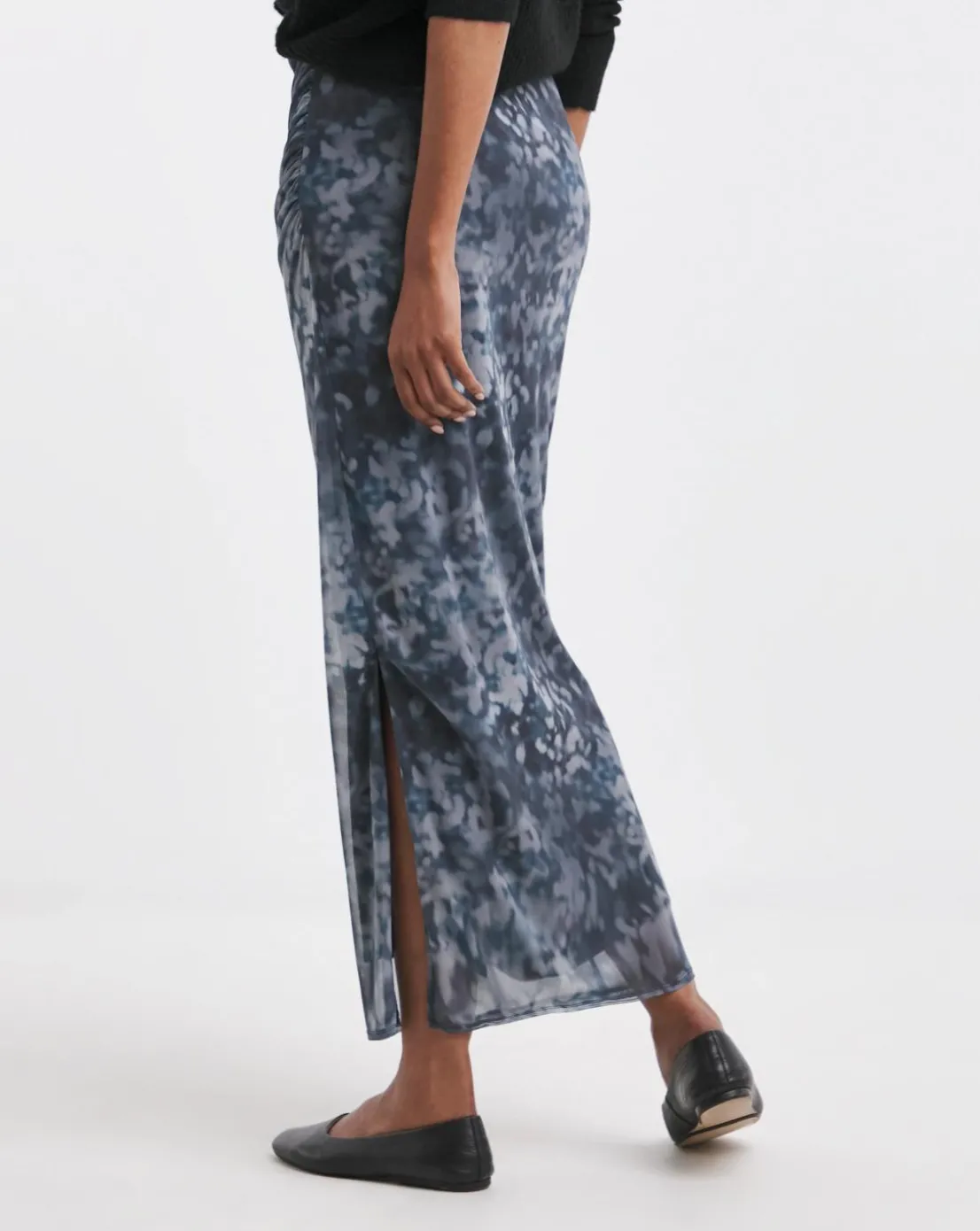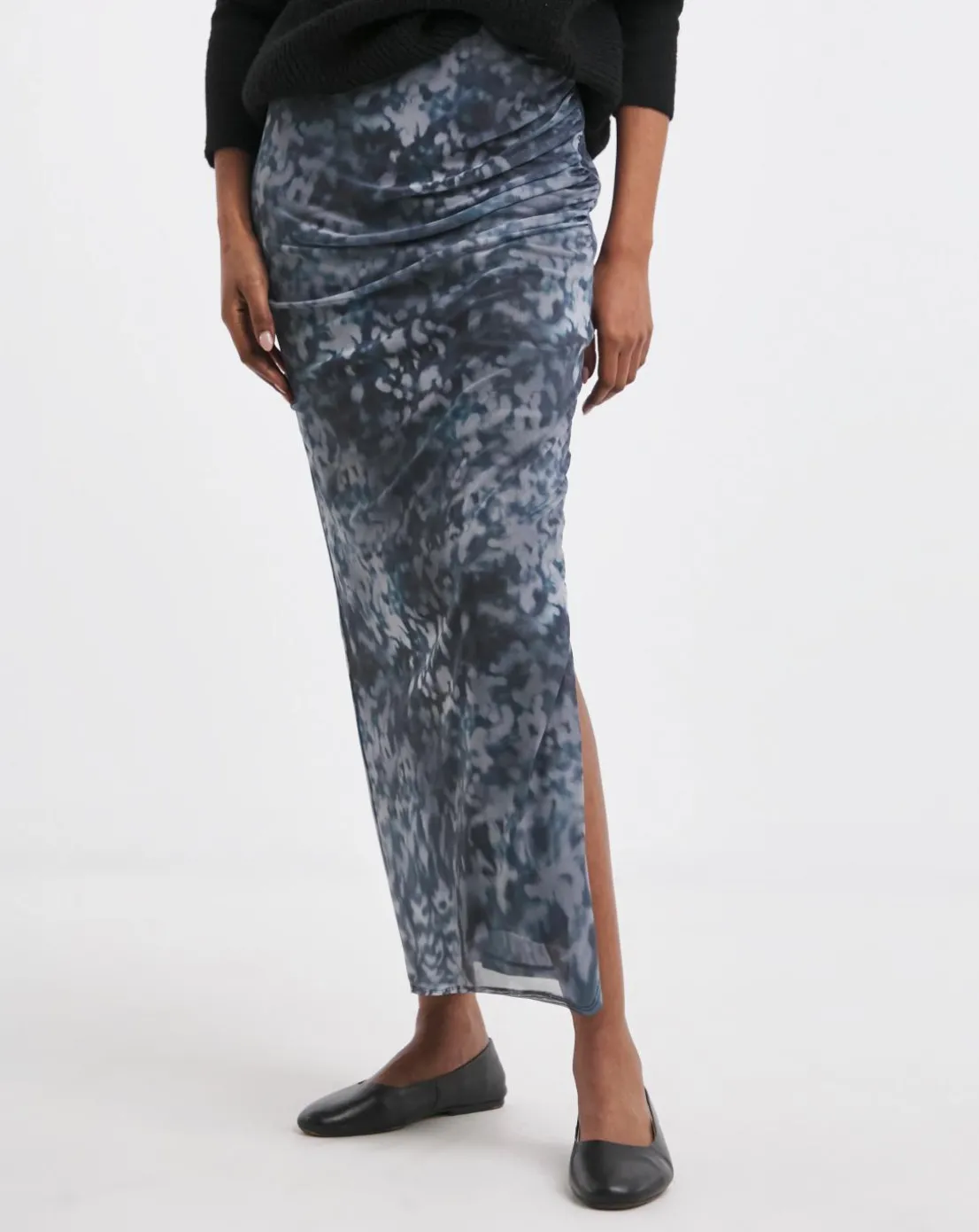 Printed Mesh Ruched Column Maxi Skirt