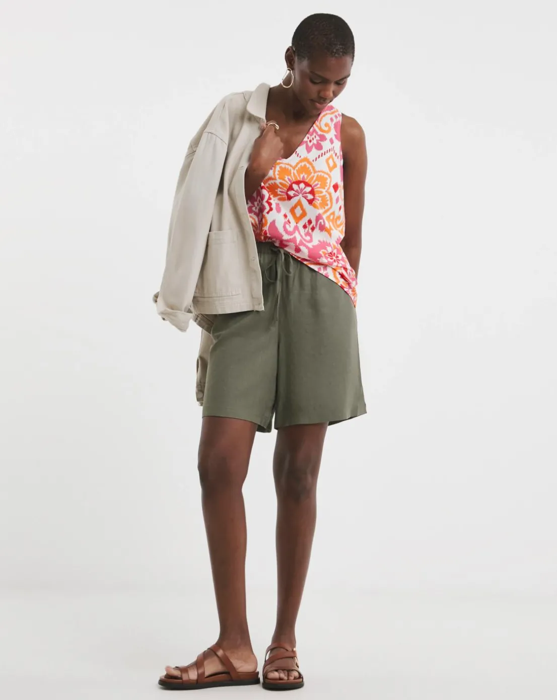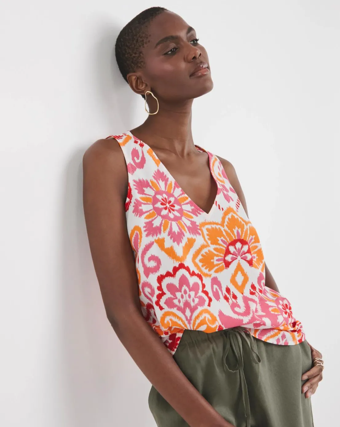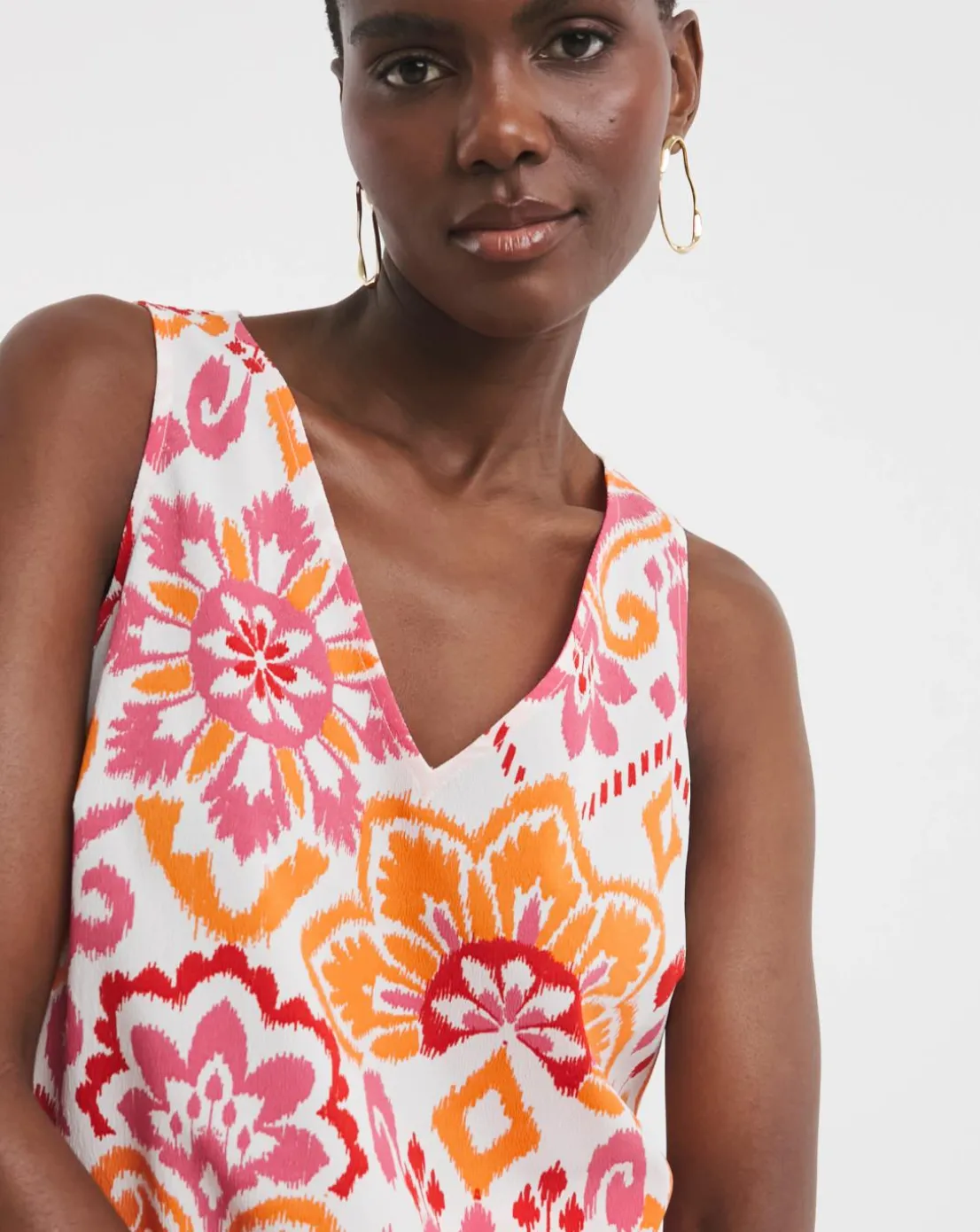 This printed V neck vest will be a staple in your summer wardrobe rotation. The bright and fun print adds a pop of colour to your outfits and will look great styled with denim or linen trousers, or shorts when the warmer weather arrives.