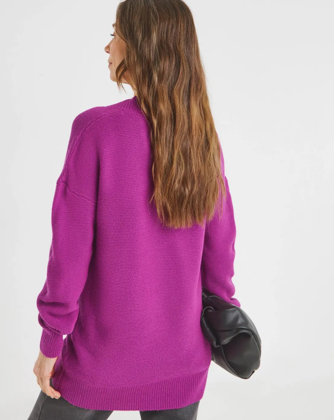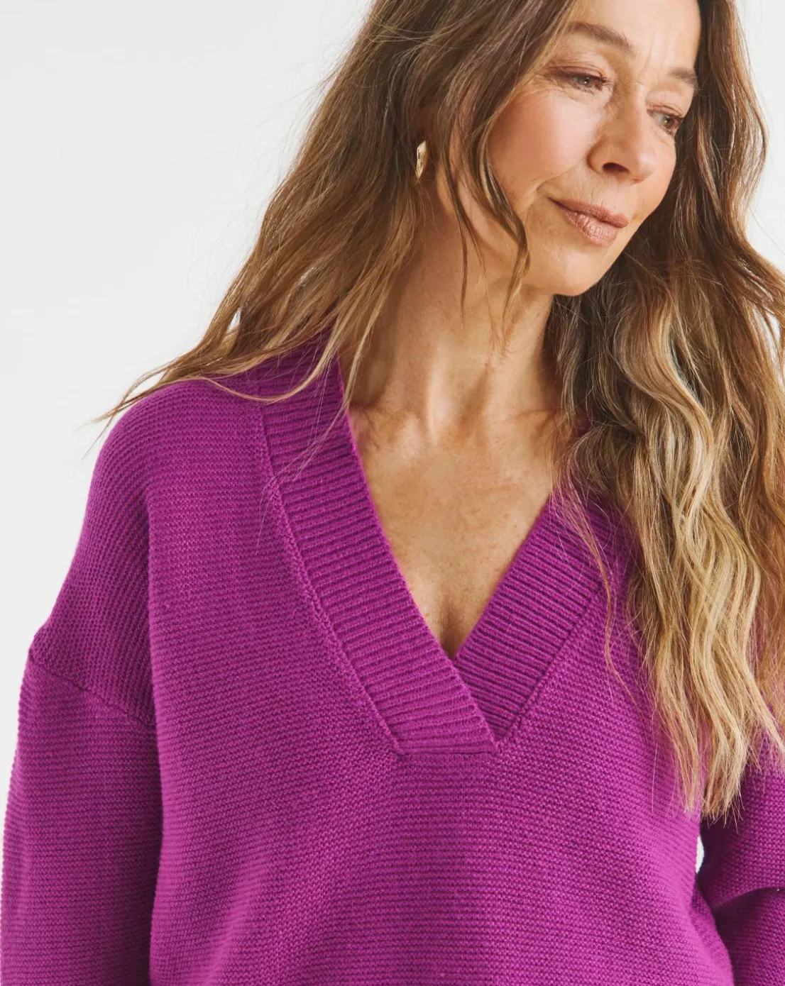 This tunic in purple features a v neckline, ribbed detailing and a curved hem.