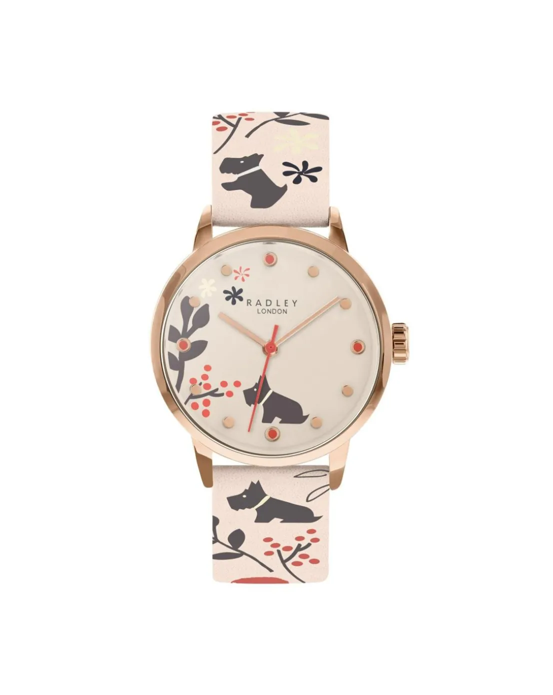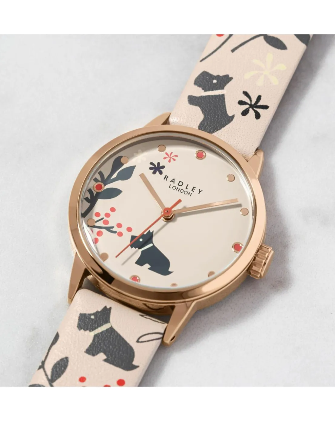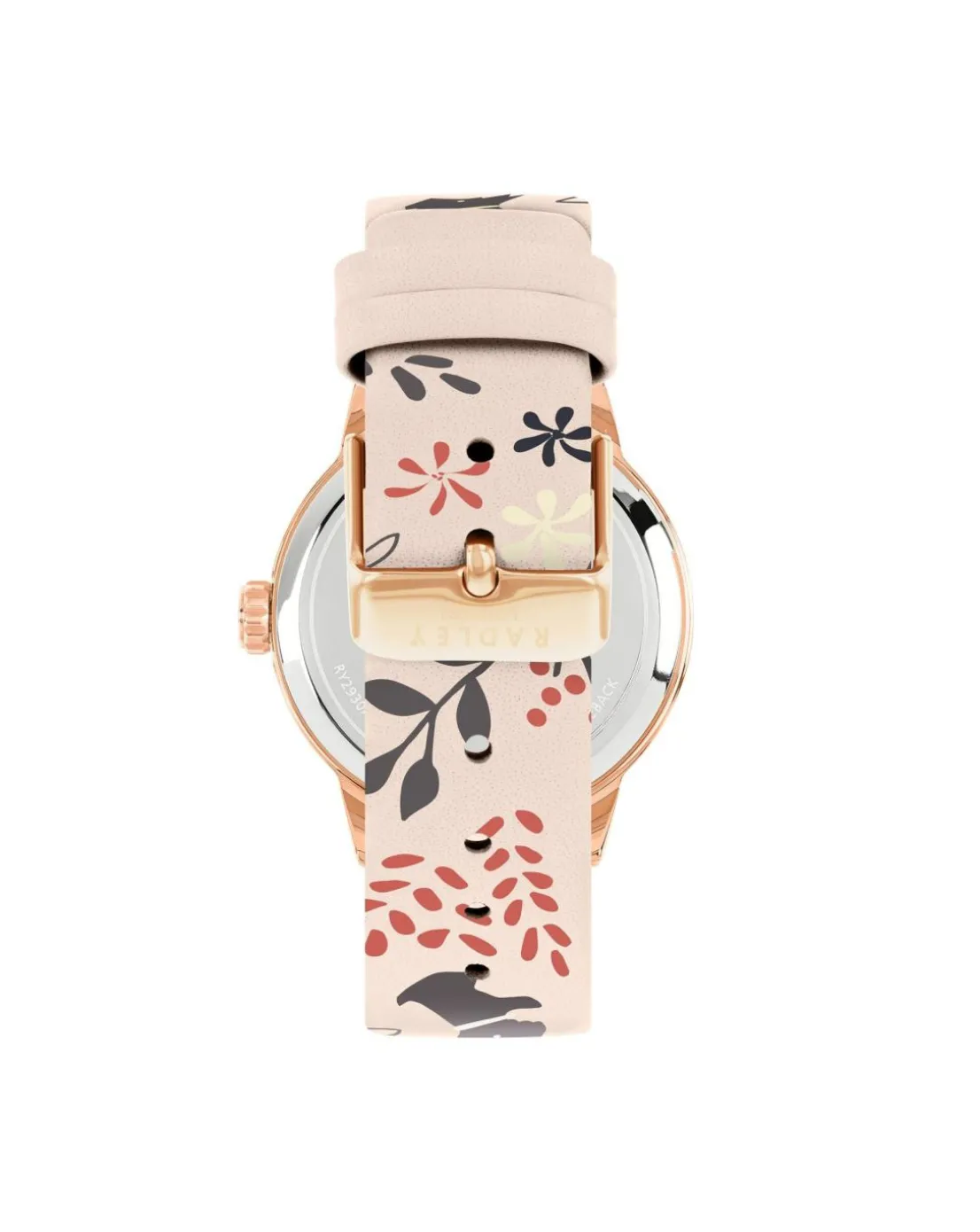 - Radley ladies dove grey Epping forest watch. Features printed Epping forest design, dove grey leather strap and rose gold case.