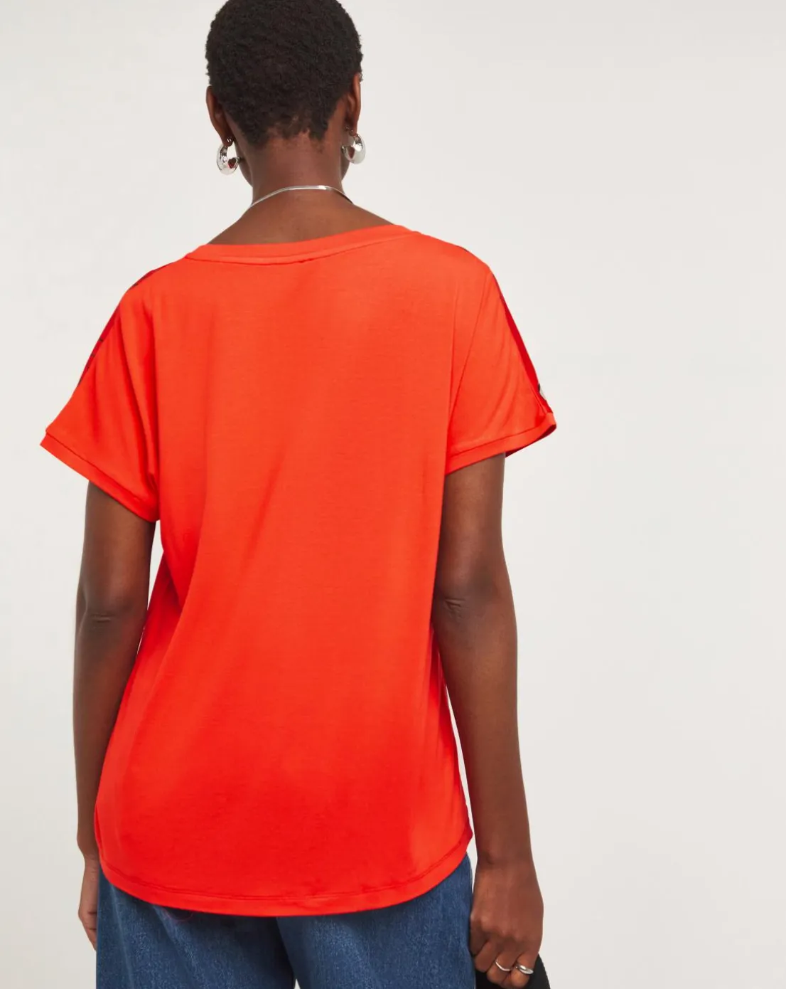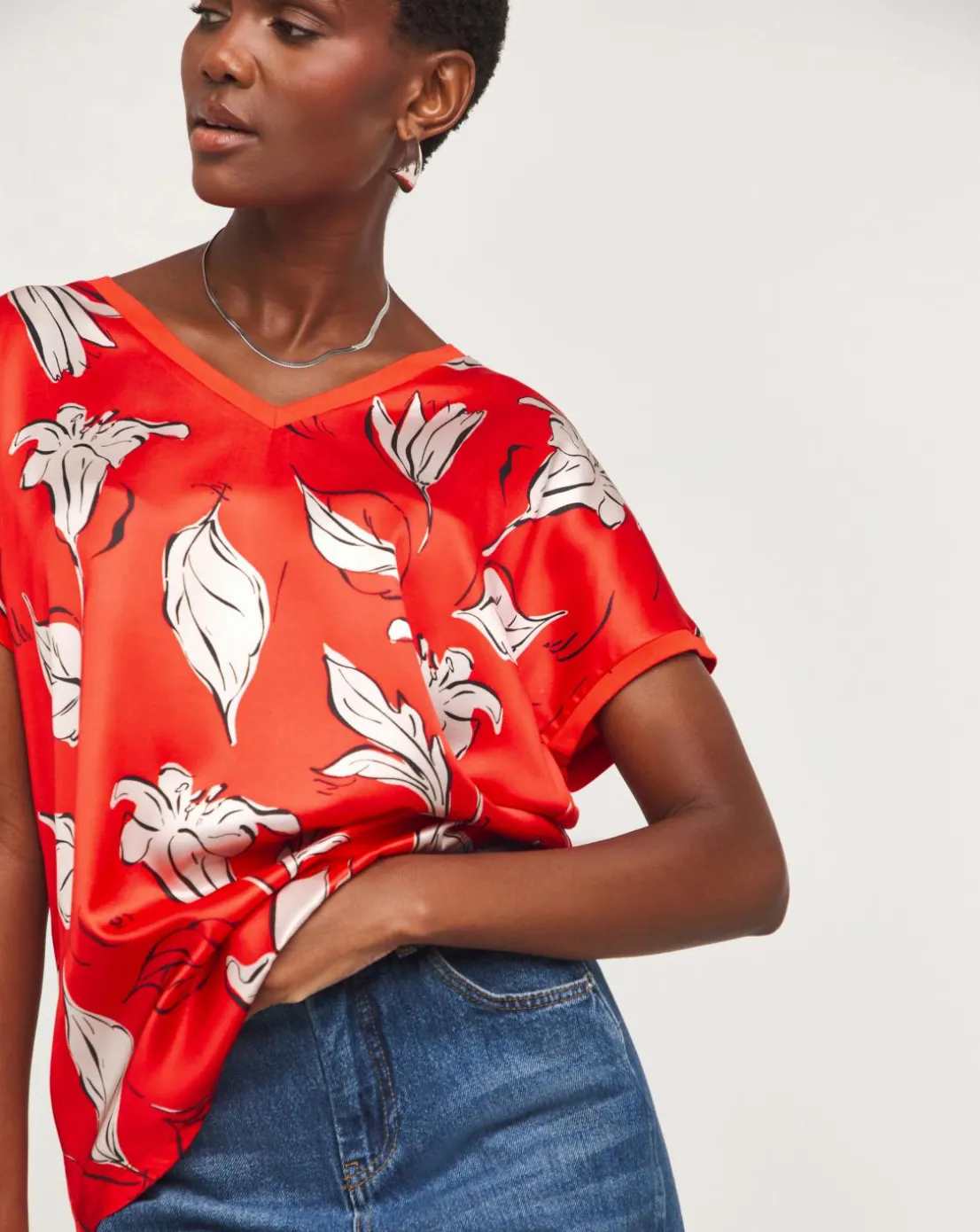 Our red floral satin front longline top is perfect for smart casual wear. It features a v-neck, short sleeves and soft jersey back.