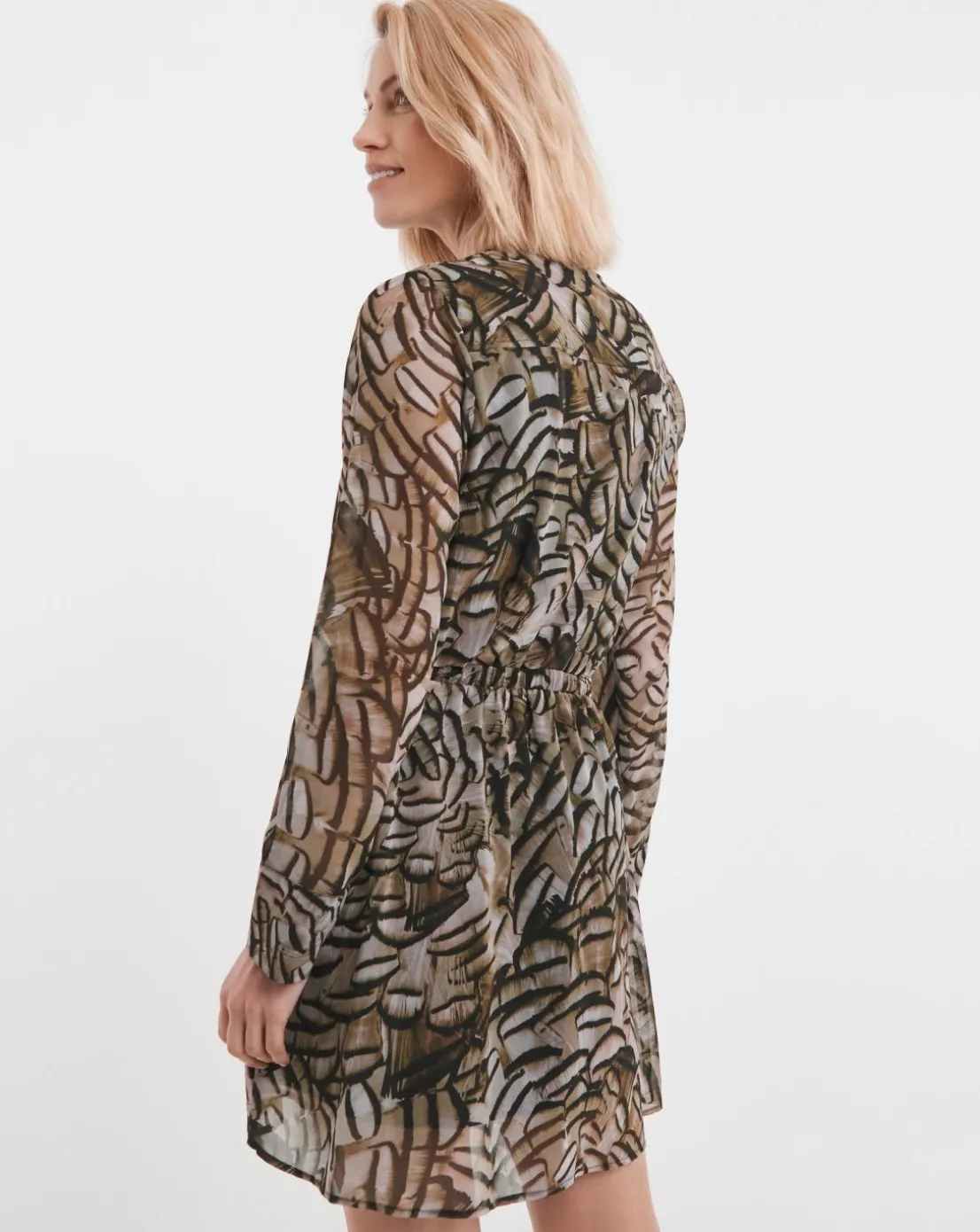 Introducing the Indium short dress, a versatile piece designed to take you from day to evening with ease. This chic dress features a faux wrap design and long sleeves, offering a flattering and comfortable fit. Adorned with our Plume print in sepia tones, it brings a touch of elegance to any occasion. Made from 55% recycled polyester, it combines style with sustainability. The easy fit ensures all-day comfort, making it perfect for any setting, whether you’re at the office or out for a dinner date.