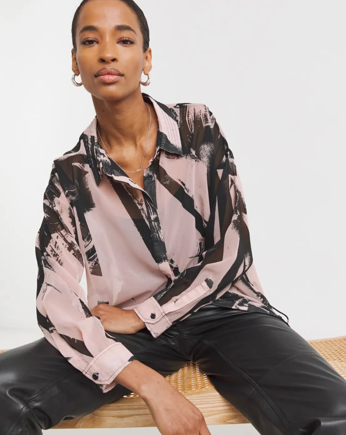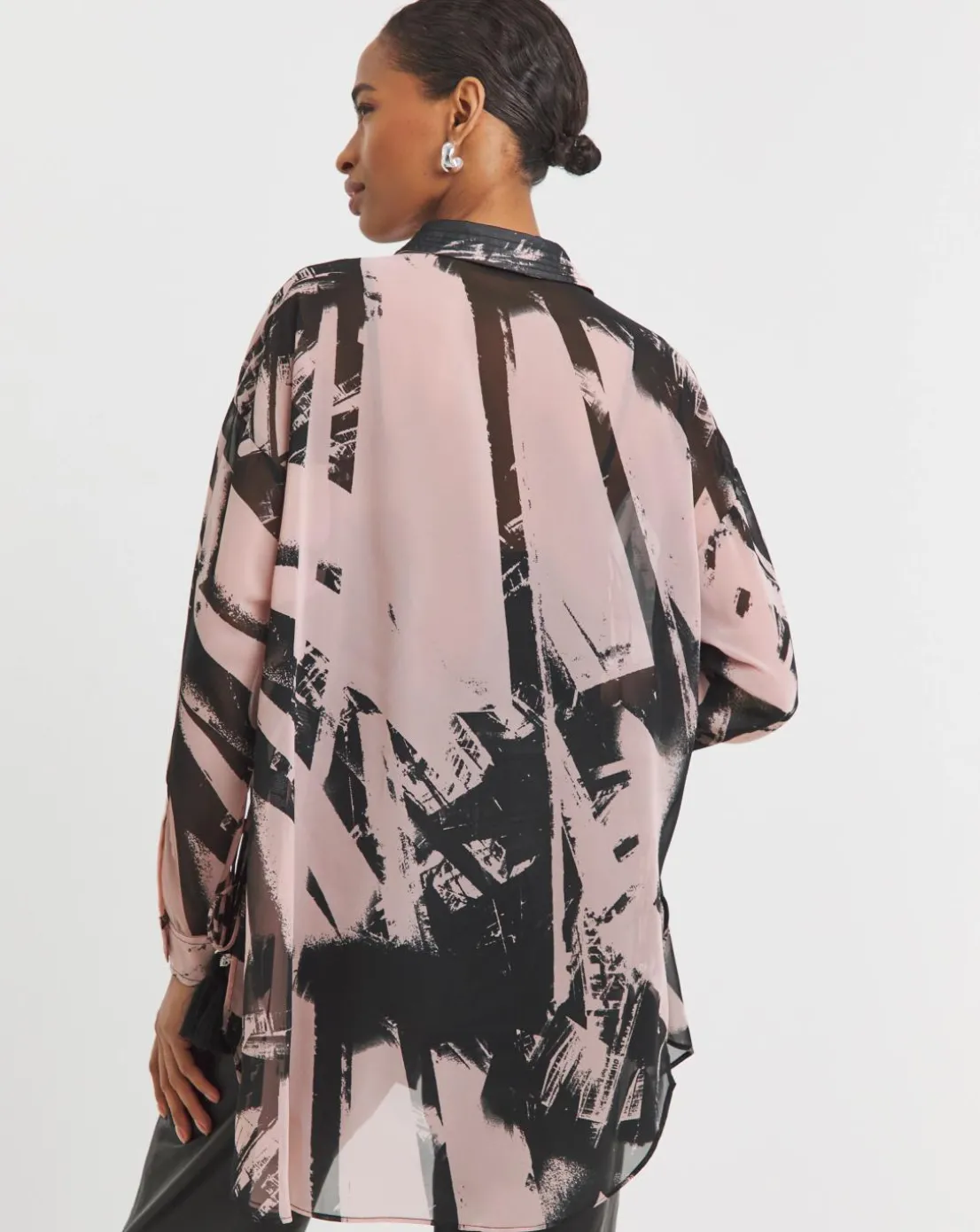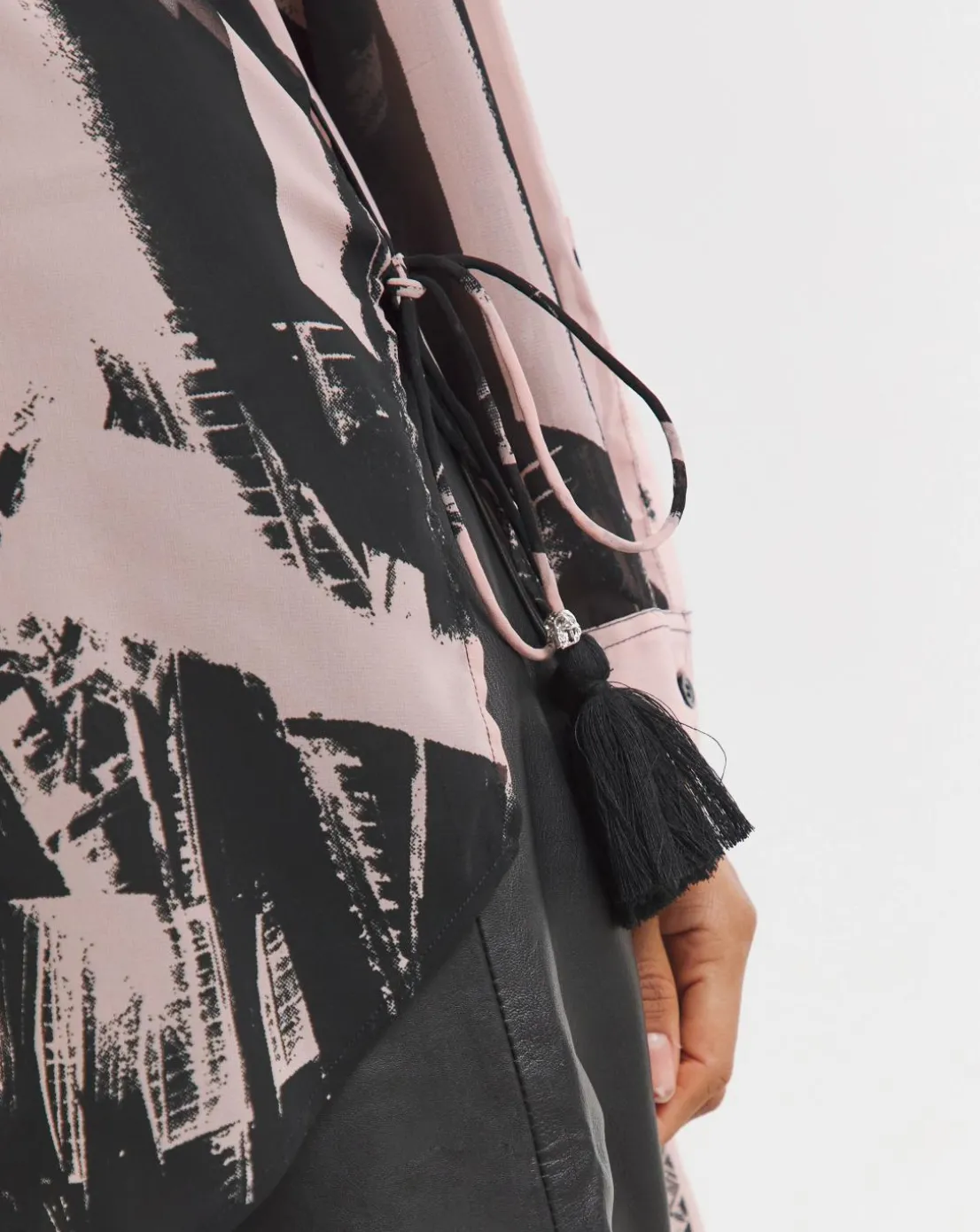 The Tanzanite shirt is a stylish choice with a classic collar shape, long sleeves, and a full button placket. It features a rounded hem, side seam slits with ties featuring skull cord ends and tassels, and is a slightly longer length than your usual shirt. Adorned with our abstract Parallel print in pink and black tones, it pairs effortlessly with leggings or tailored trousers for a chic and versatile look. Or wear with the matching skirt for a co-ordinated look.