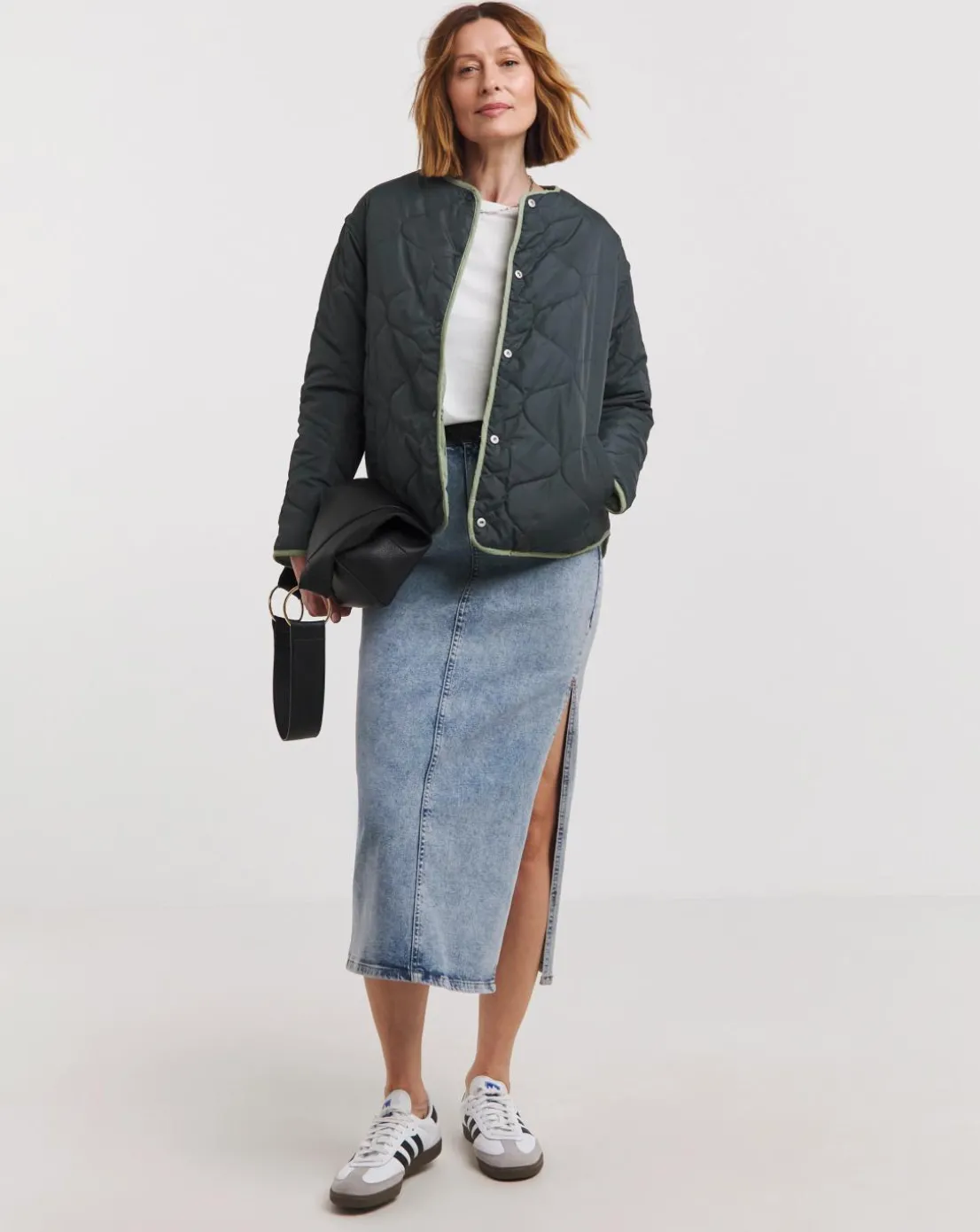 This reversible quilted jacket is the perfect outer layer for Spring Summer. Featuring a flattering boxy shape, popper fastening and two front pockets as well as being reversible providing multiple ways to wear!
