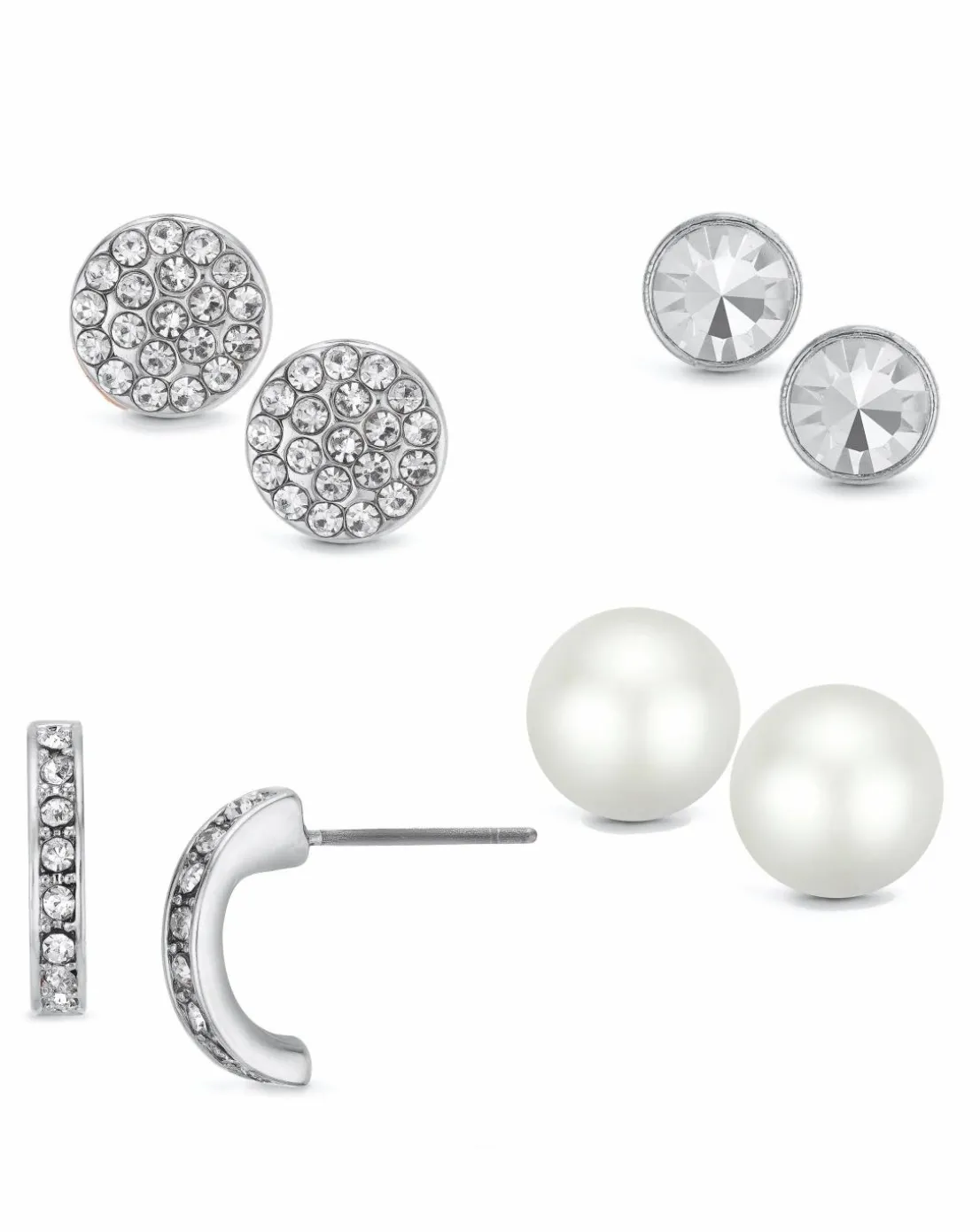 This pretty earrings set is the perfect way to mix up your look every day! Includes four fun designs in polished rhodium tone, with a choice of crystal studs, pave crystal discs, petite hoops and smooth pearl. Comes packaged in a Buckley London gift box.