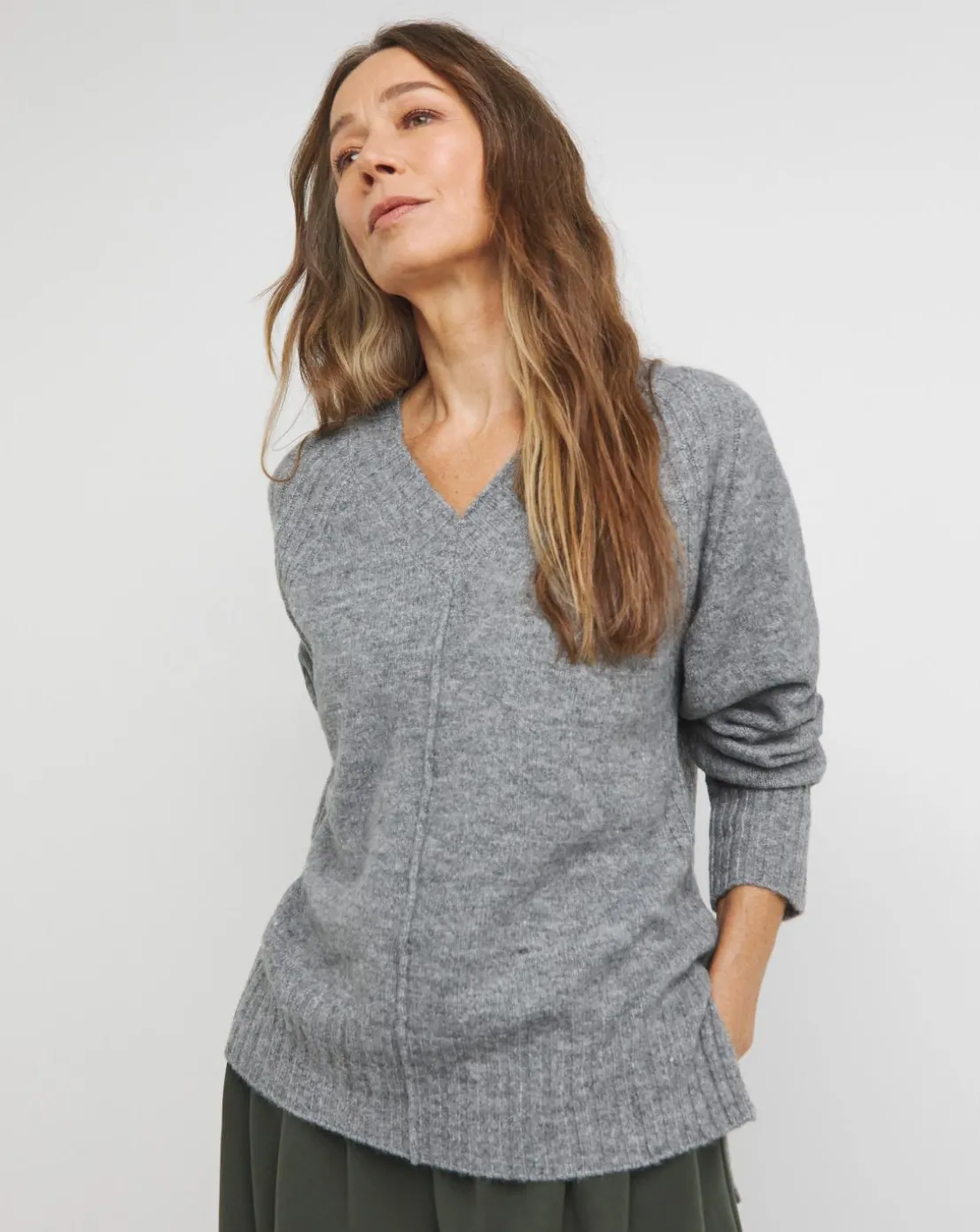 Our gorgeous jumper in charcoal features a flattering v-neck, ribbed detailing, long leeves and a regular fit.