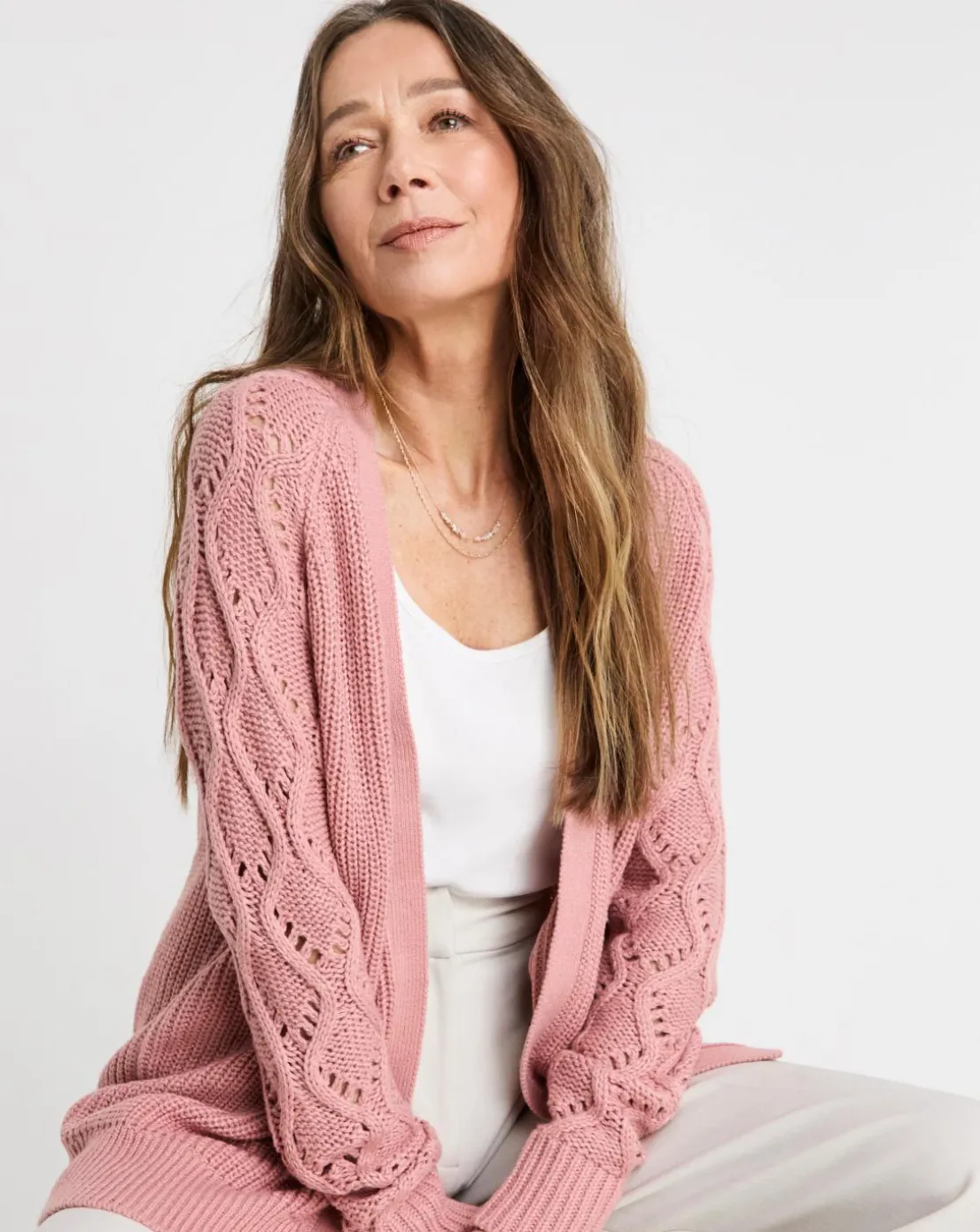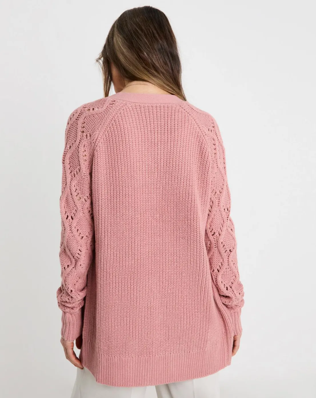 This edge to edge cardigan in rose features stitch detailing on the sleeves and a relaxed fit.