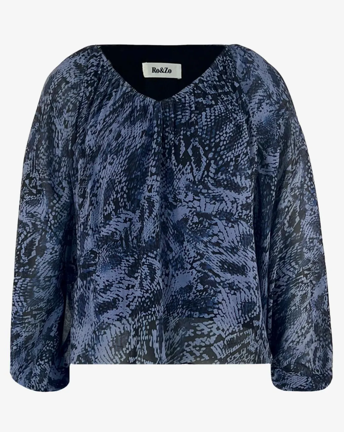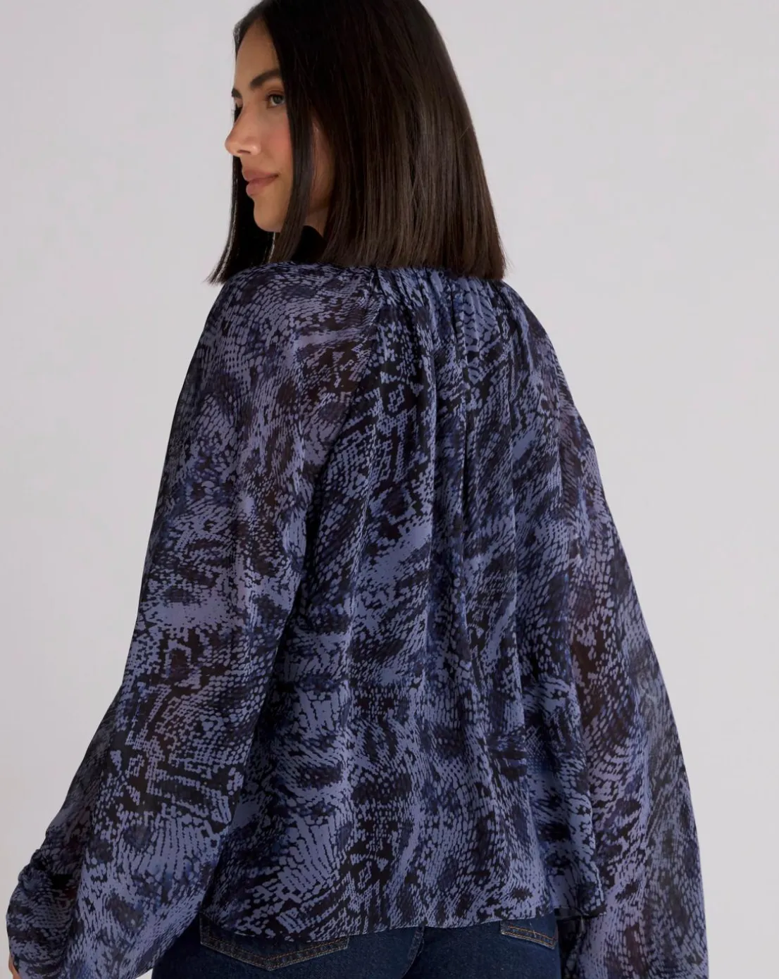 Our Navy Snake Print Blouson Sleeve Blouse is made from viscose chiffon, featuring a gathered V neckline and a boho silhouette. This lined blouse includes volume sleeves with elasticated cuffs and falls below the waistband. It’s a perfect blend of style and comfort.