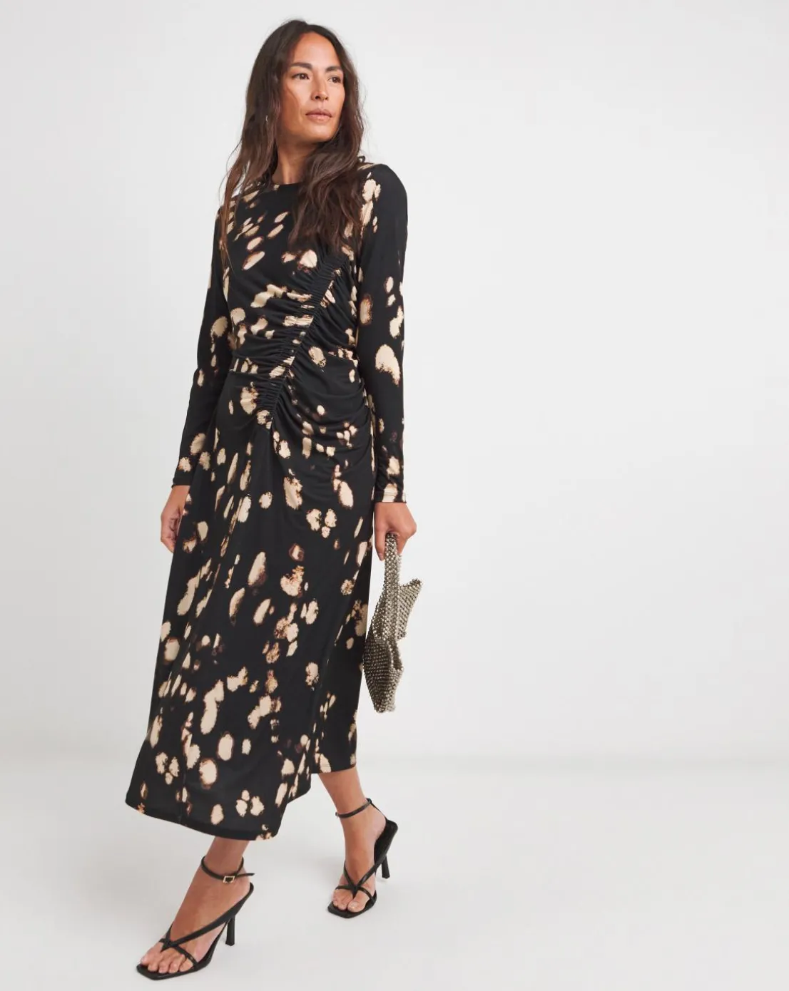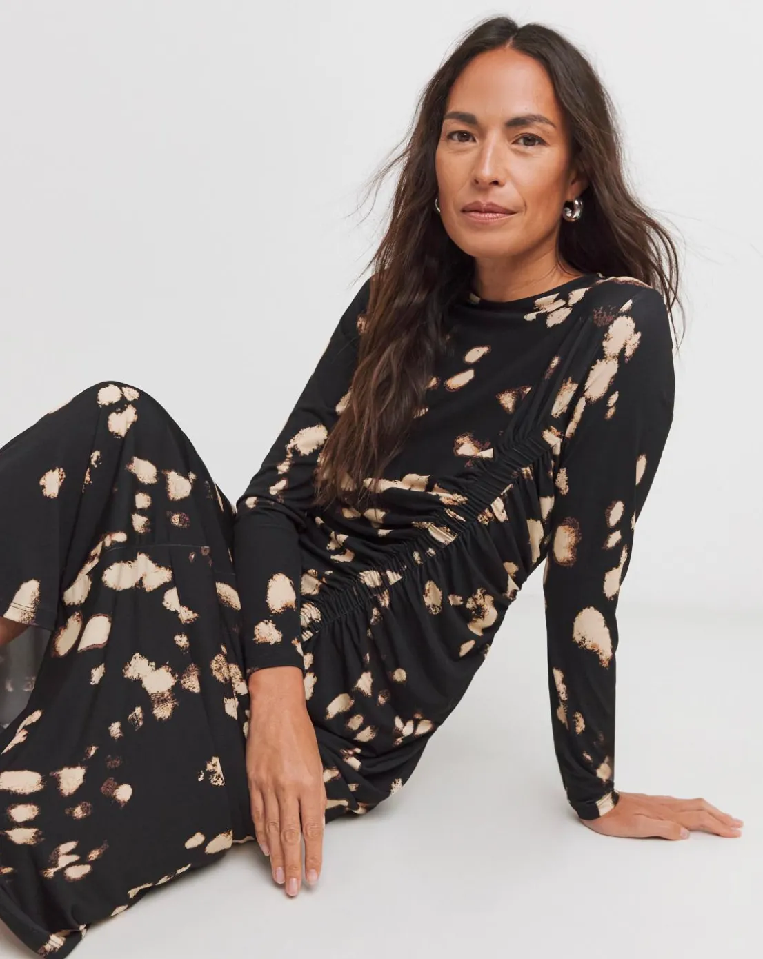 This ruched seam detail midi dress comes in a black animal print. The dress features a ruched seam detail that creates texture and coverage over the stomach, a crew neckline, long sleeves and a midi length 48 inches.