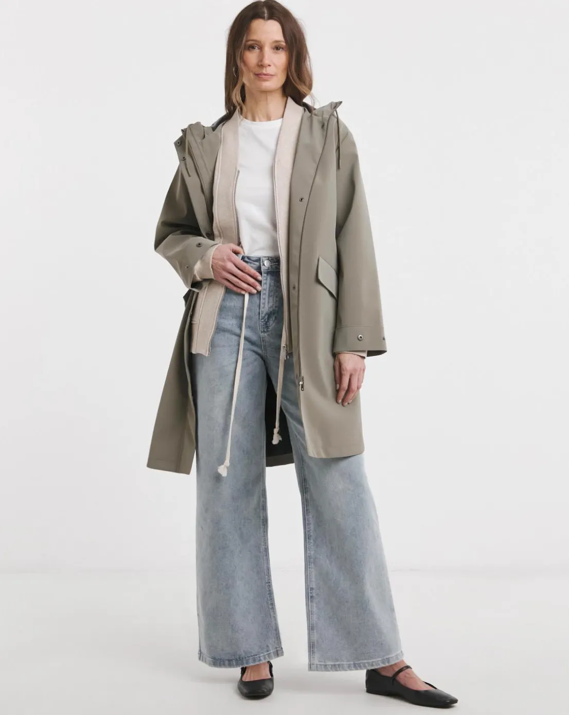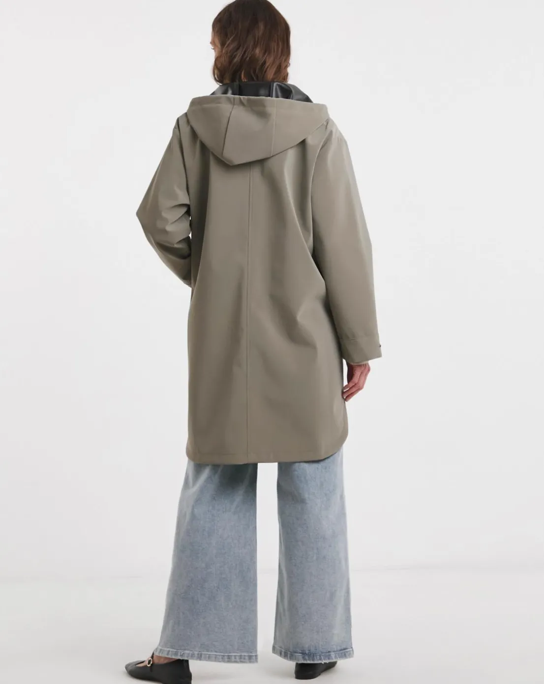 Crafted from a water resistant, sleek rubberised fabric, this lightweight coat offers protection against the elements while maintaining a modern, minimalist look. Featuring front pockets and adjustable toggles on the hood. Stylish and practical, throw over any outfit.