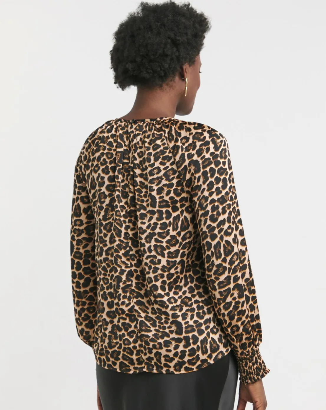 Feel like your best self in this satin leopard print blouse. Perfectly styled with black jeans, boots and a bold red lip, it’s a look you’ll want to have on repeat this season!