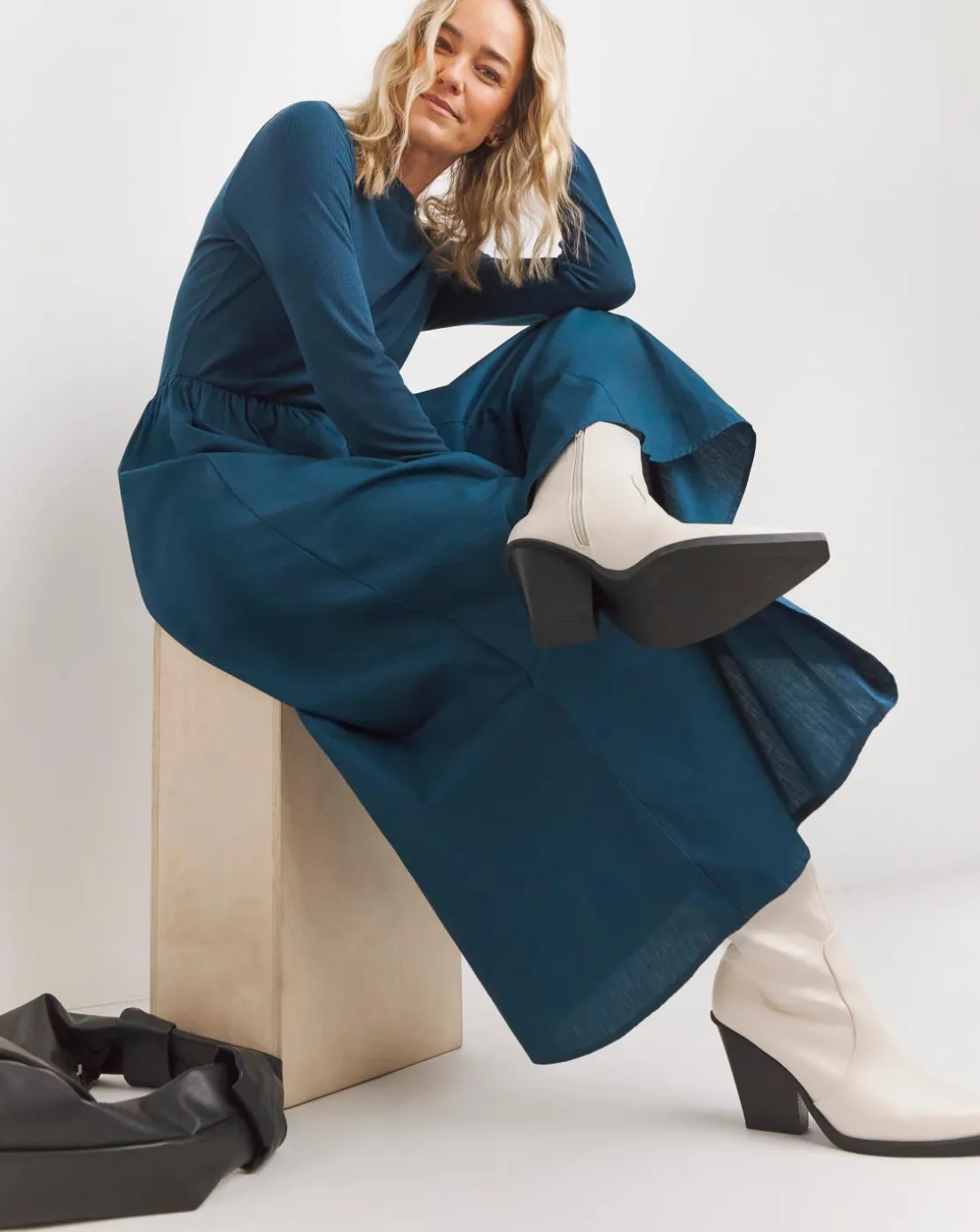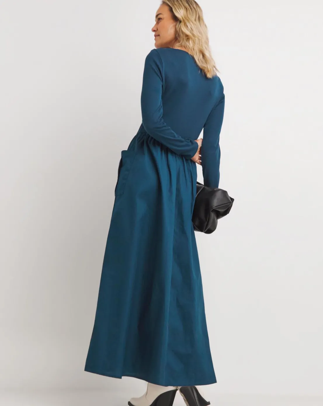New In is our slash neck rib poplin skirt dress with pocket detailing. This gorgeous dress comes in a petrol blue colourway, the length falls to maxi 50 inches.