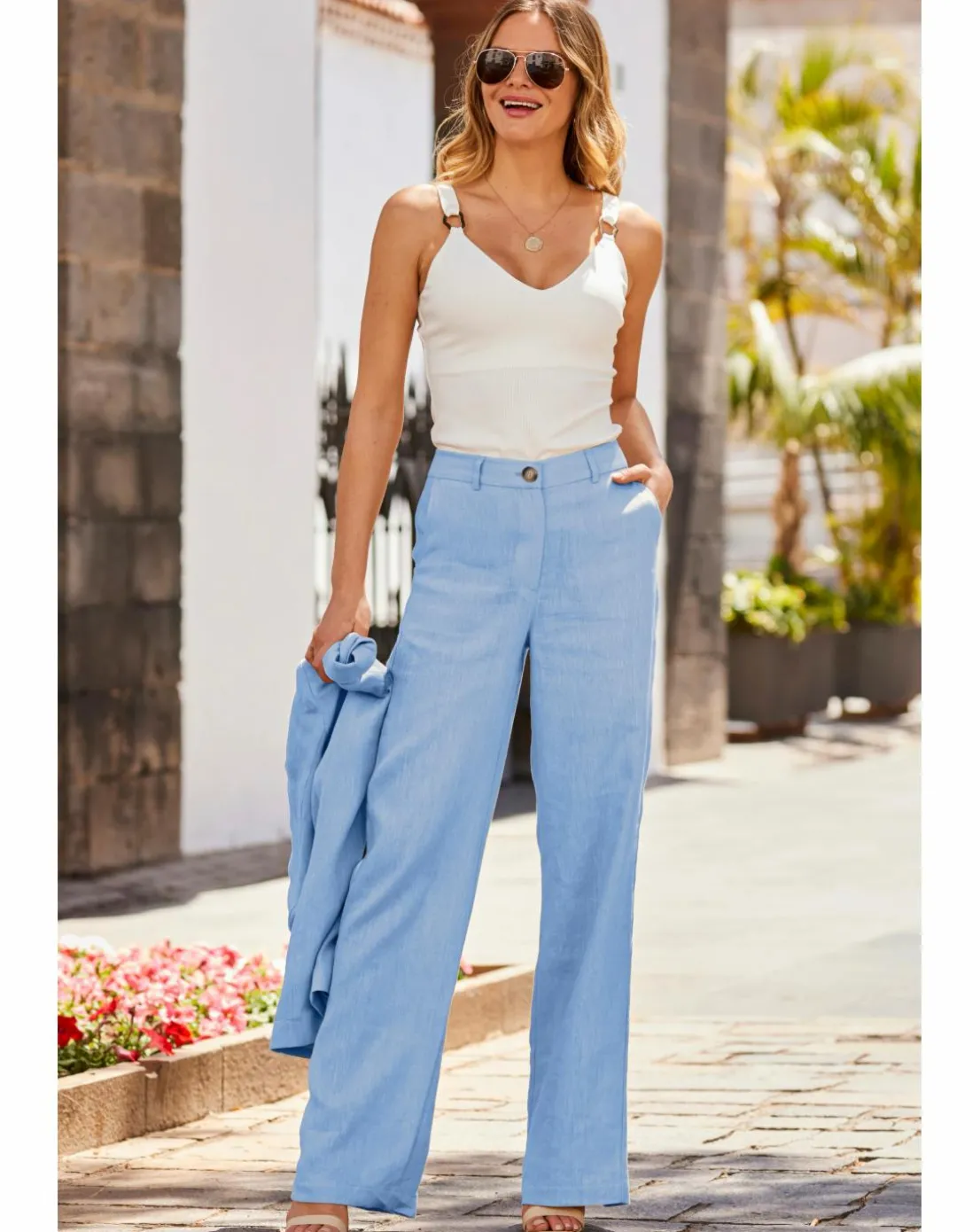 Slip into summer’s coolest trousers, crafted from luxe lightweight linen, trending wide legs – comfy chic and cool, fastening with an elegant mock-horn button, you’re going to need the matching blazer, dress them up with heels and a cami down with a vest top and flat sandals