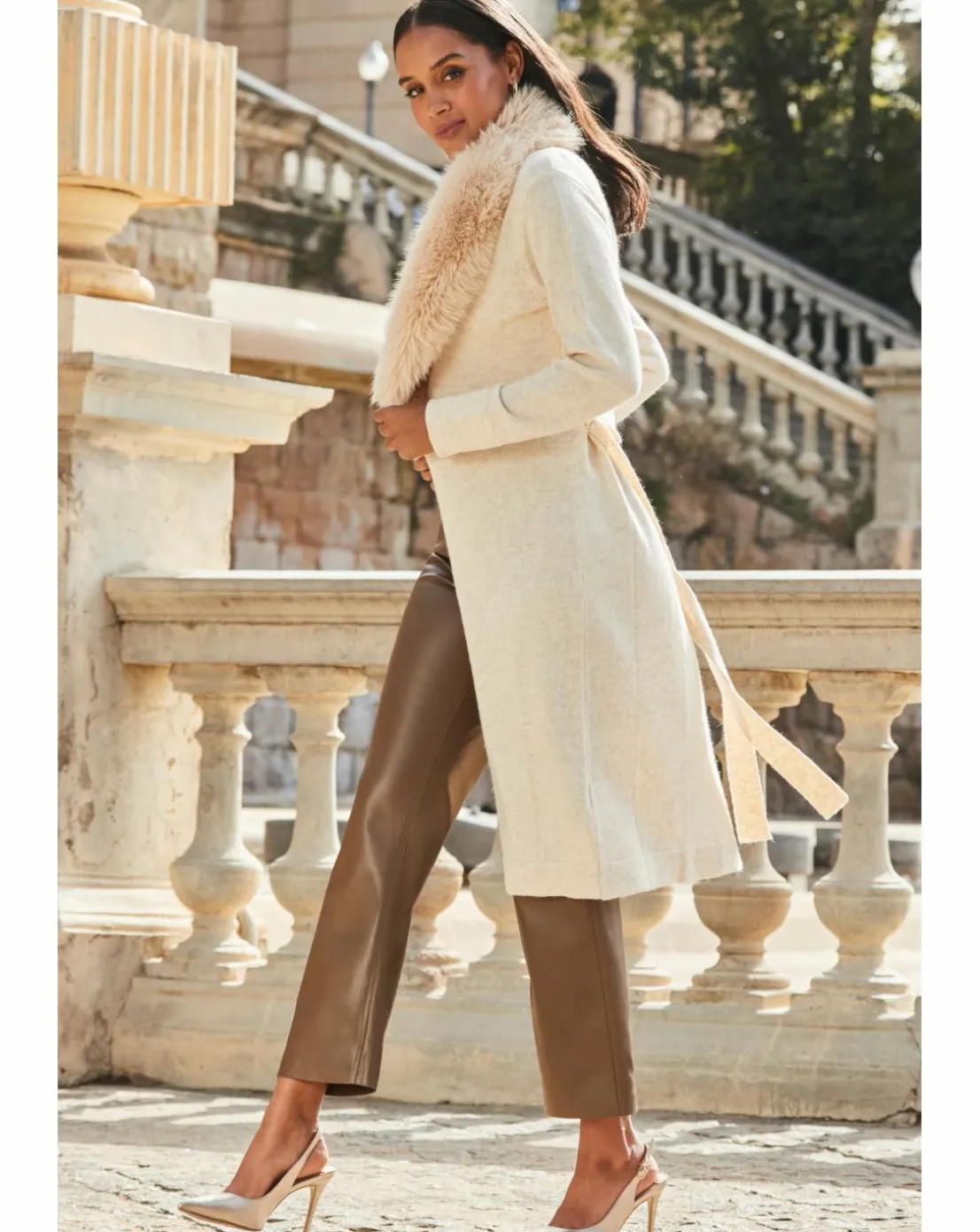 Layering has never looked so luxe, on-trend longline hem and self tying belt, plush faux fur collar ups the glam factor, soft cosy knit in a chic cream hue, slip it over a leather pencil skirt for work-to-wine style, elevate your go-to jeans and boots combo.