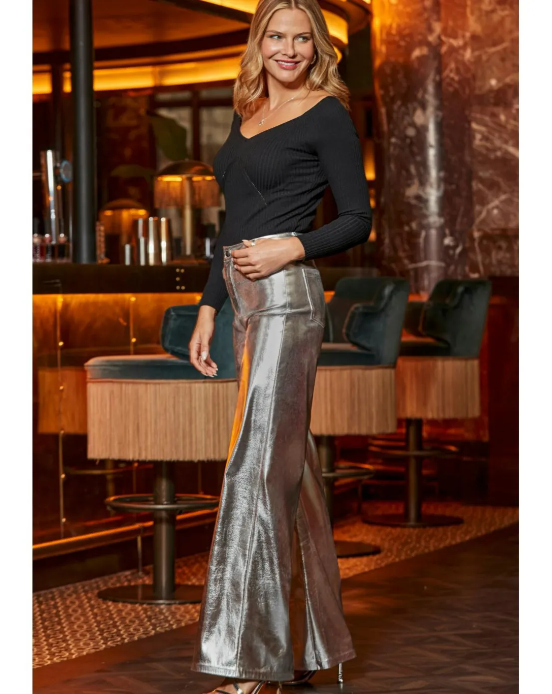 Trousers that’ll turns heads. Crafted from the softest faux leather and cut to a statement palazzo silhouette. Luxe metallic finish for maximum impact.