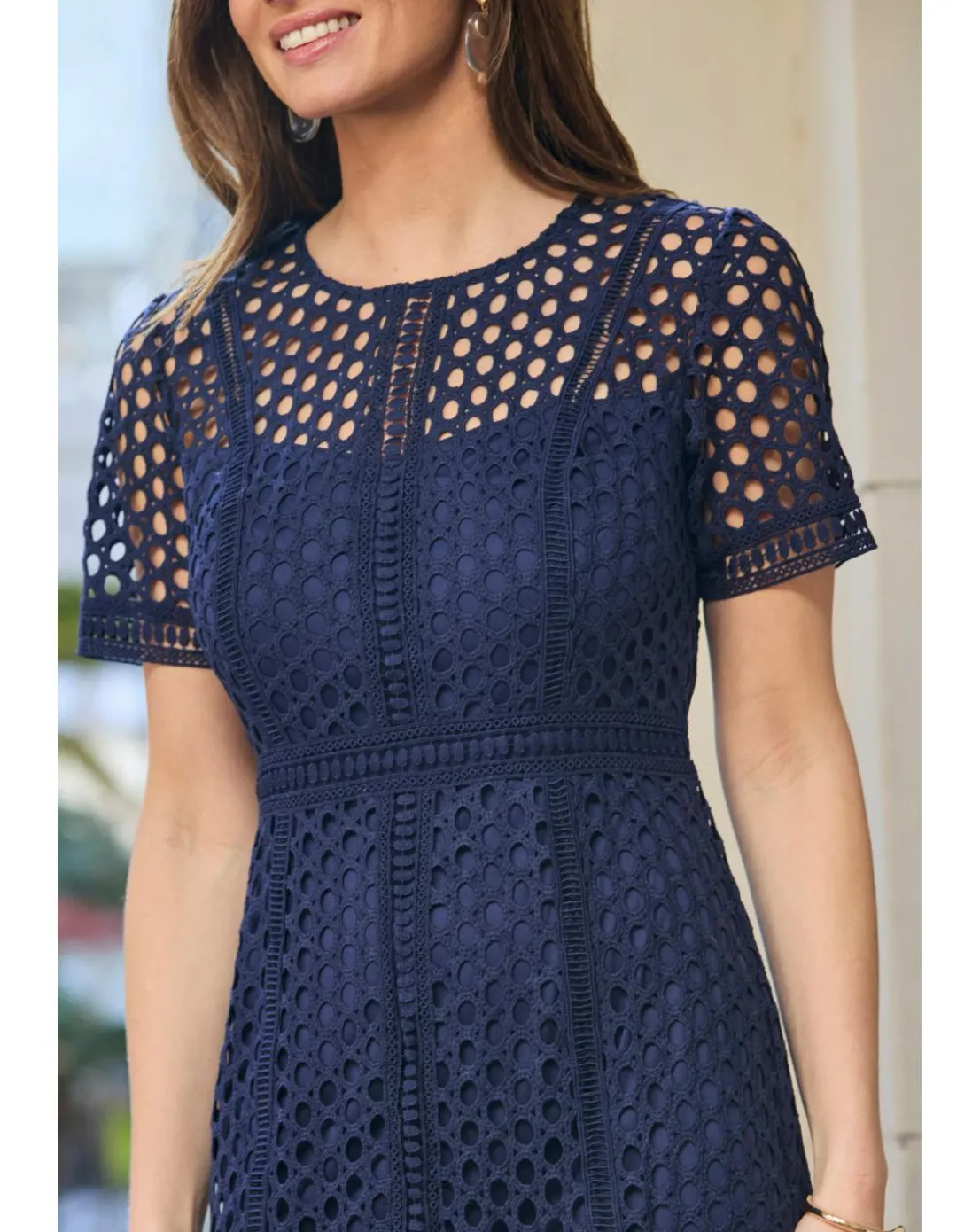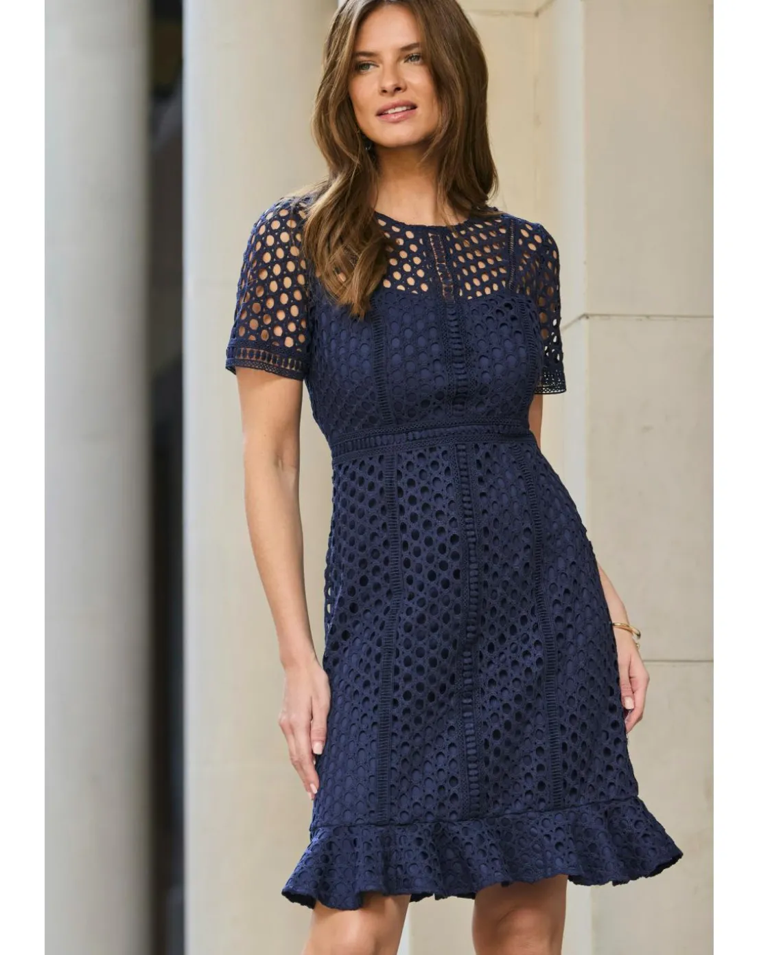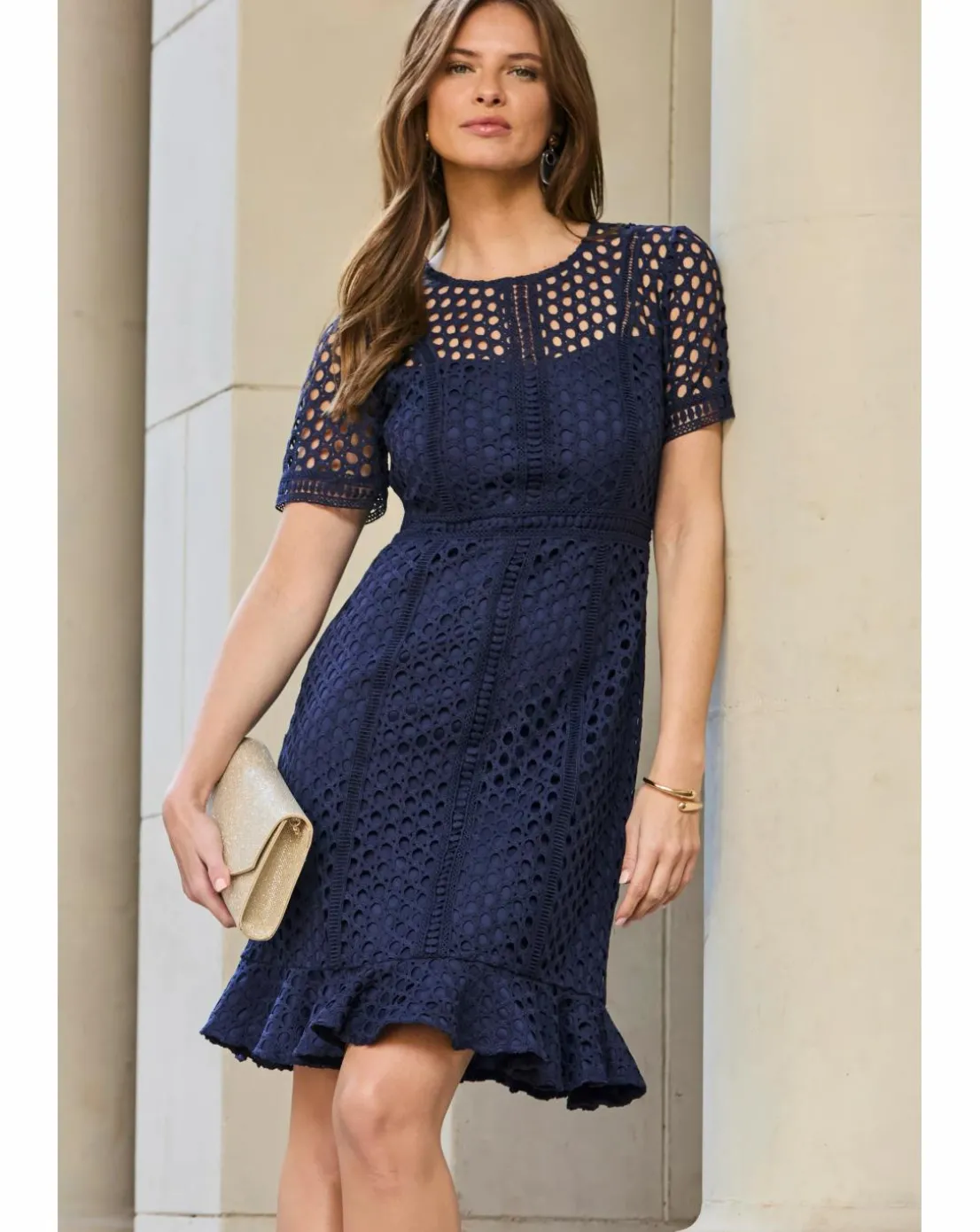 You’ve just found the perfect plus one, nothing flatters like a fit & flare silhouette, crafted from luxe geometric lace, framed by a stunning sheer neckline, cinched waist falls to a flirty flippy hem, navy looks gorgeous with gold accessories.