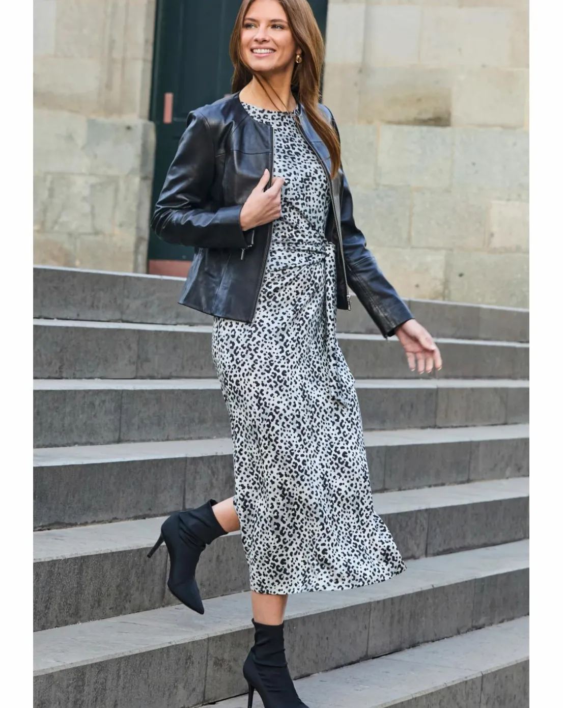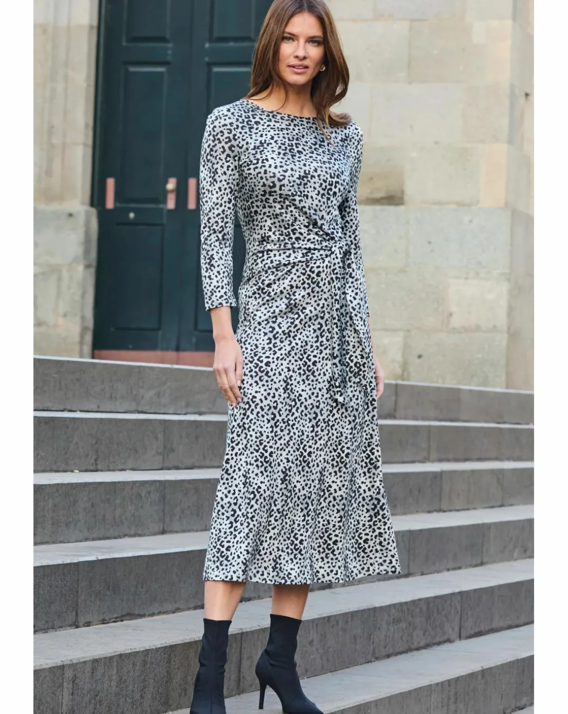 Found the day dress of dreams, crafted from the softest jersey for comfort and style, you’ll love how the tie detail shows off your waist, cut in our signature flattering fit & flare silhouette, forever on-trend monochrome animal print, we love it with trainers and a biker.
