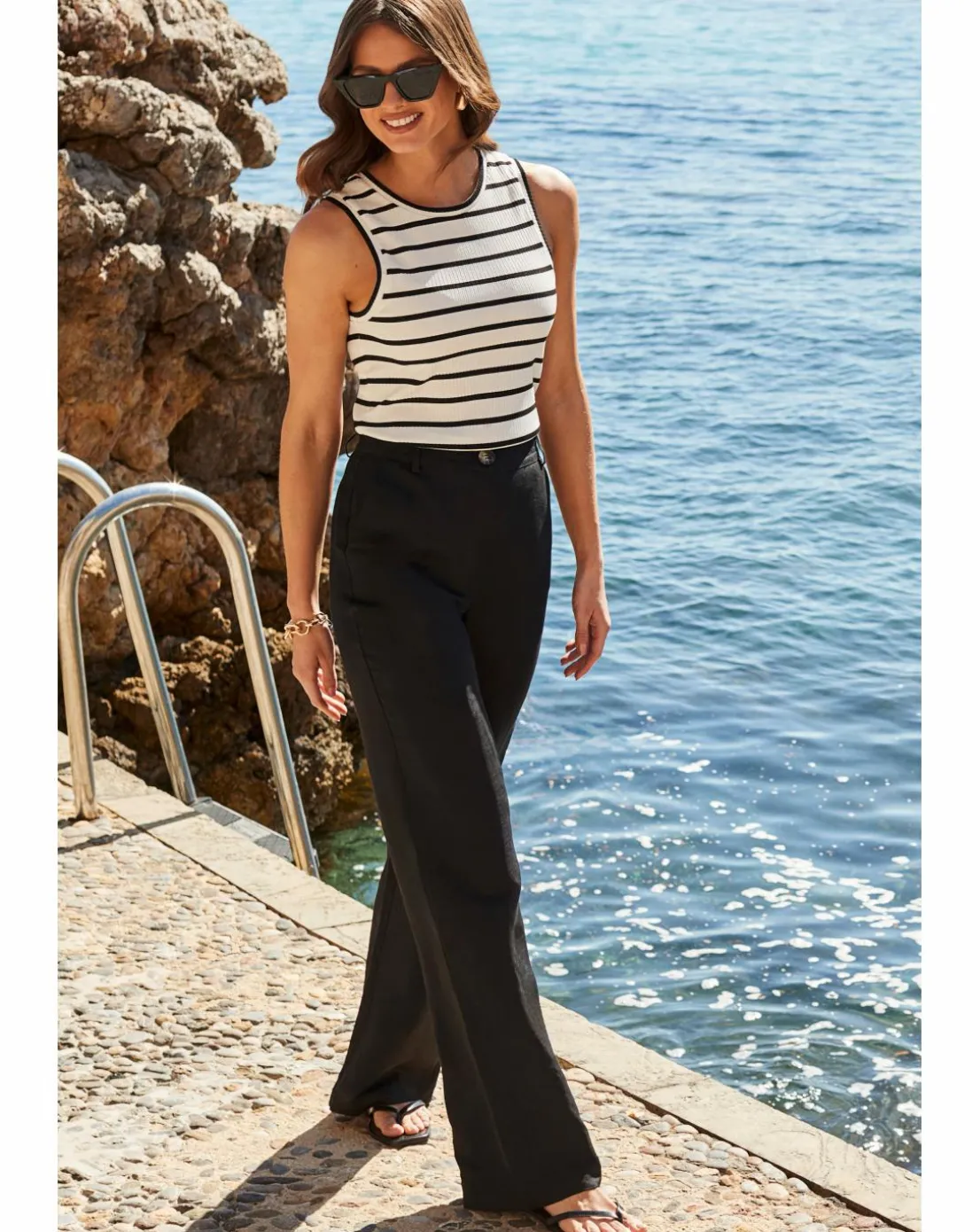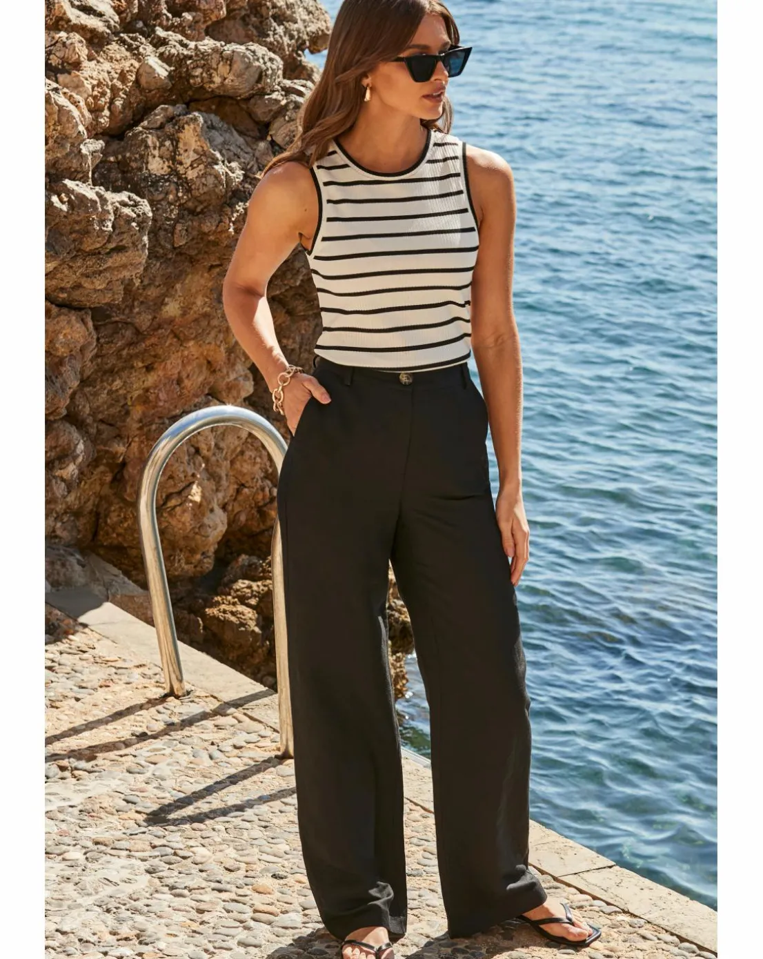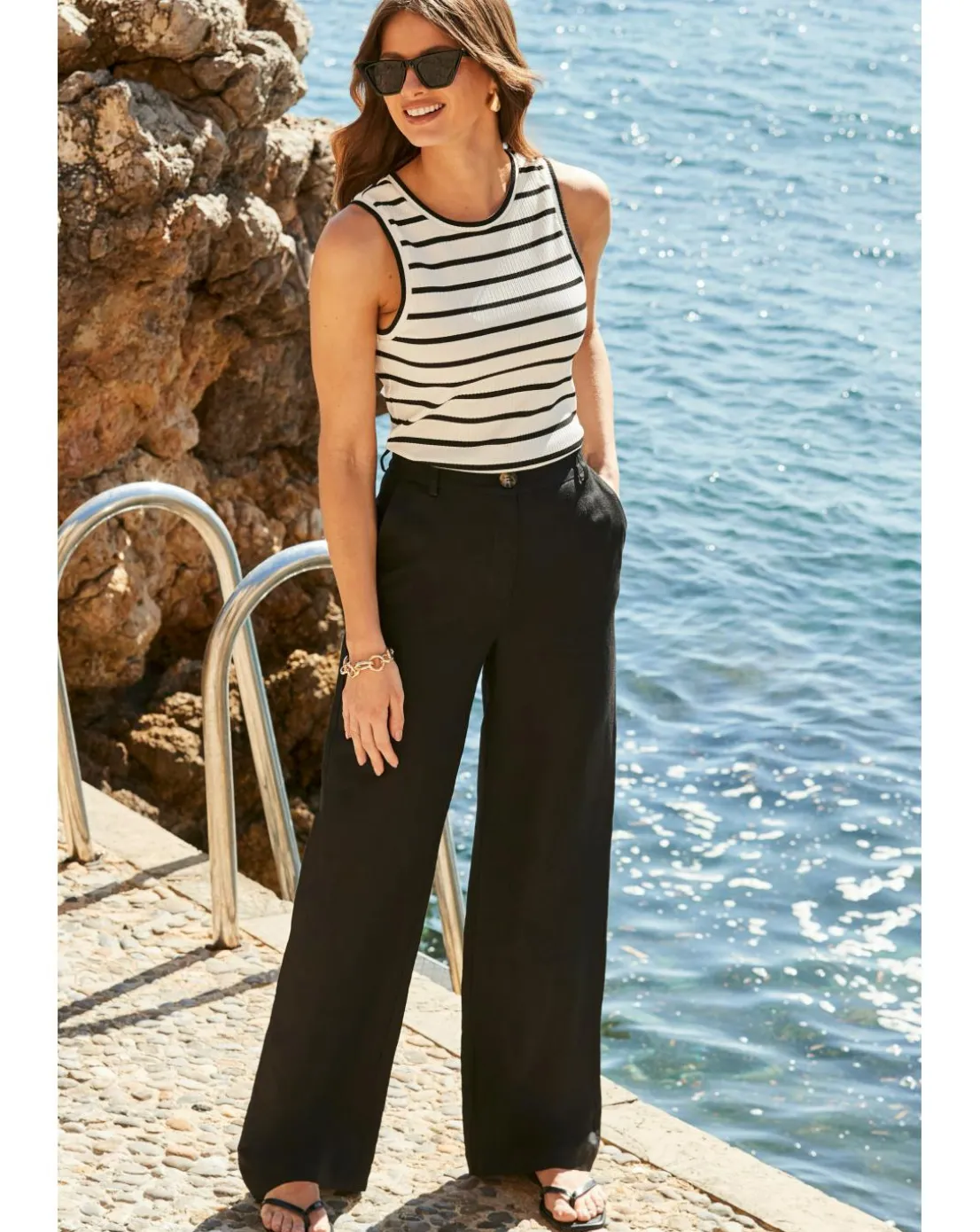Every wardrobe needs a pair, linen – the chic way to stay cool, breezy wide-leg cut for comfort and style, luxe tortoiseshell button, slip over swimwear on beach days, take them out with a cami and strappy heels.