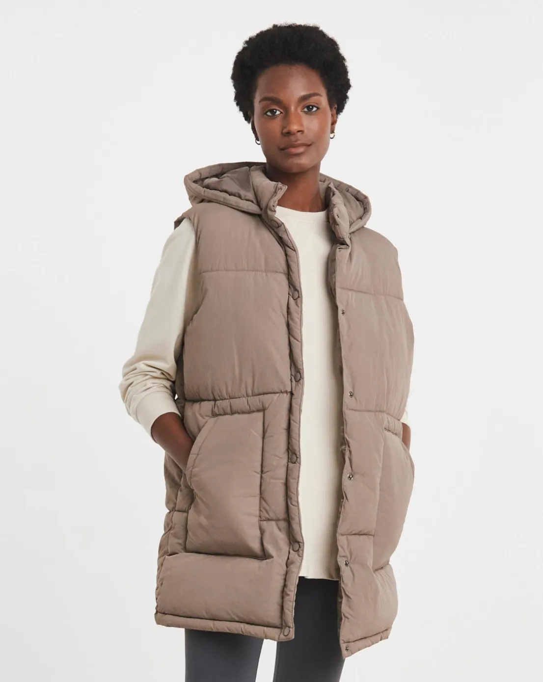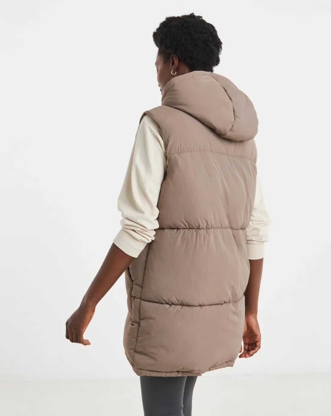 In a flattering longline length, this gilet is the perfect throw over style for any outfit, for an added layer of comfort and style. Featuring a hood, button fastening front and front pockets.