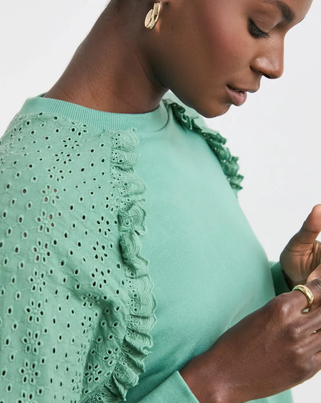 Our broderie sleeve, frill detail sweatshirt is a beautiful addition to your wardrobe. Pair with jeans and flats for a stylish look.