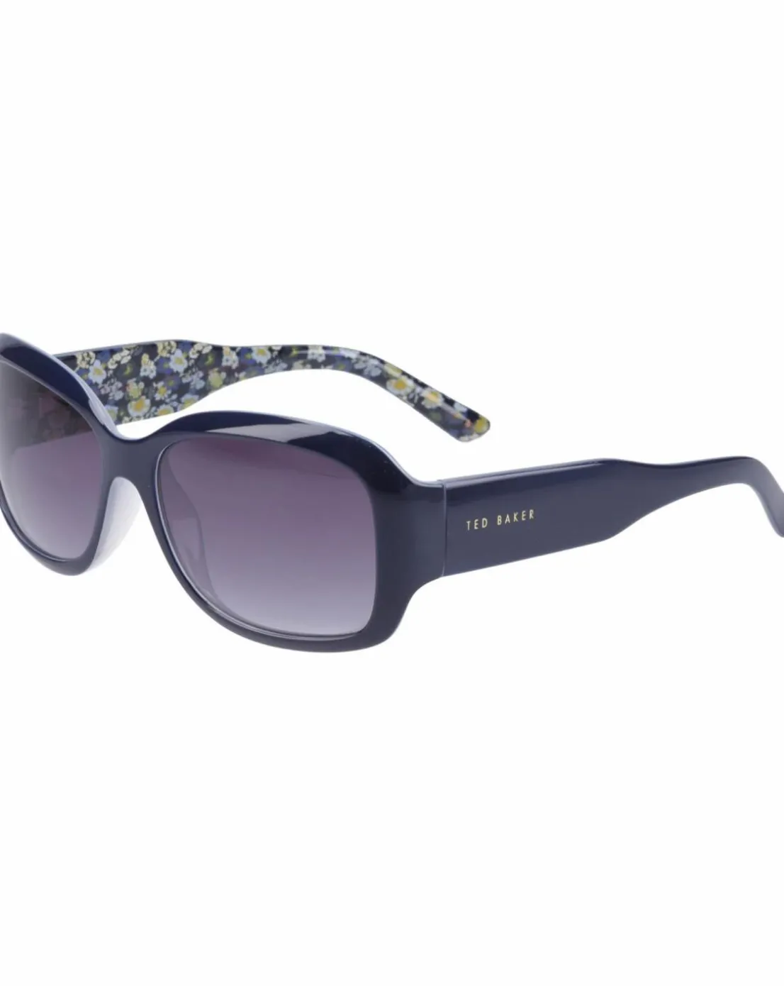 - These rectangular sunglasses from Ted Baker are slightly wrapped and have deep temples giving you great all-round coverage. Shown here in classic navy, backed with milky white, the inner temples feature a blue toned floral Ted Baker exclusive print
