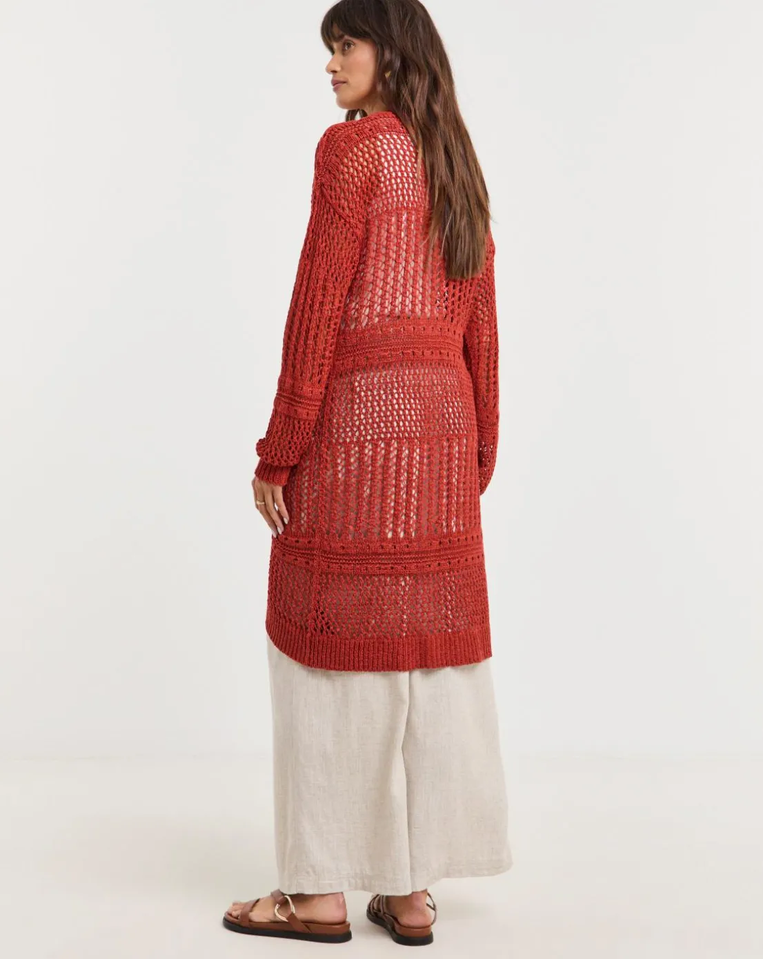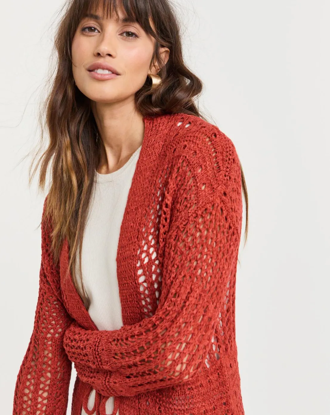 Our maxi cardigan in terracotta comes with crochet detailing, a tie front and a relaxed fit. This cardigan is perfect for the summer months.