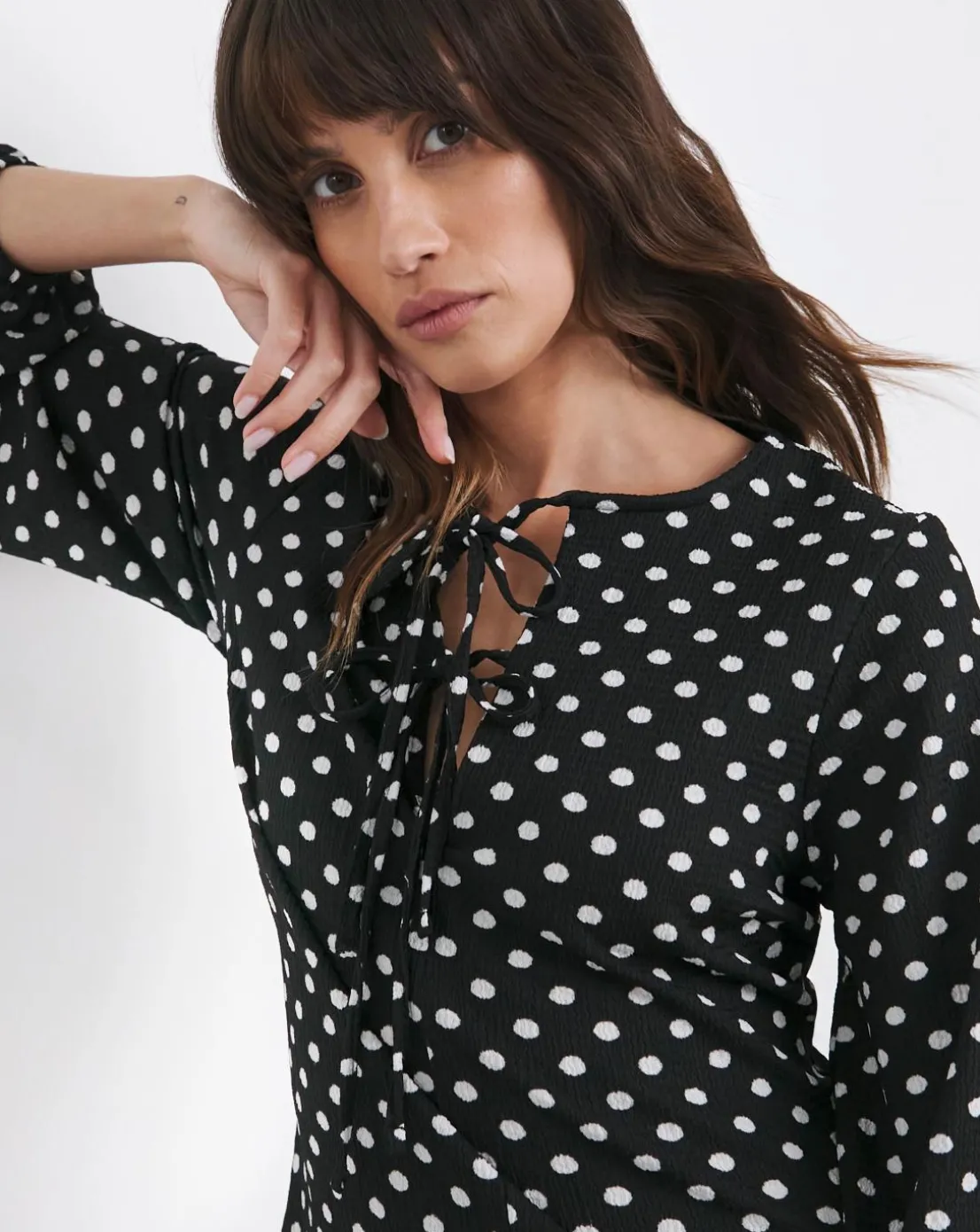 This textured jersey tie detail maxi dress comes in a black spot. The dress features, a textured jersey material, half sleeves, crew neckline with keyhole and tie detailing, maxi length 50 inches.