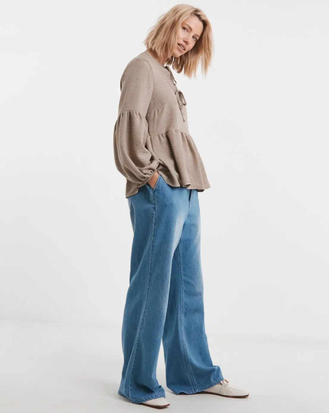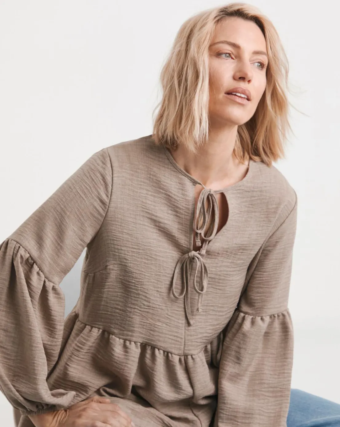 This blouse features a smock design, balloon sleeves and tie details, and paired with its soft stone colour it offers a romantic feel to any outfit. Just add denim and ballet flats for an effortlessly chic look.