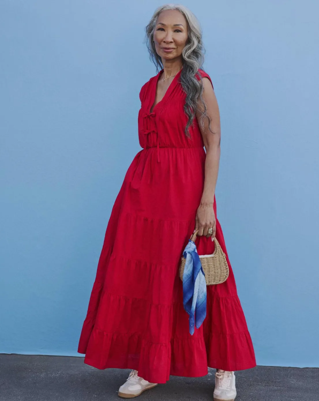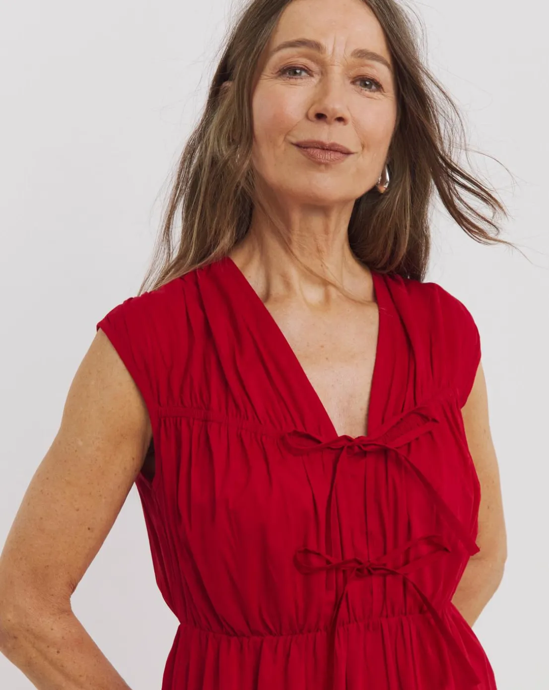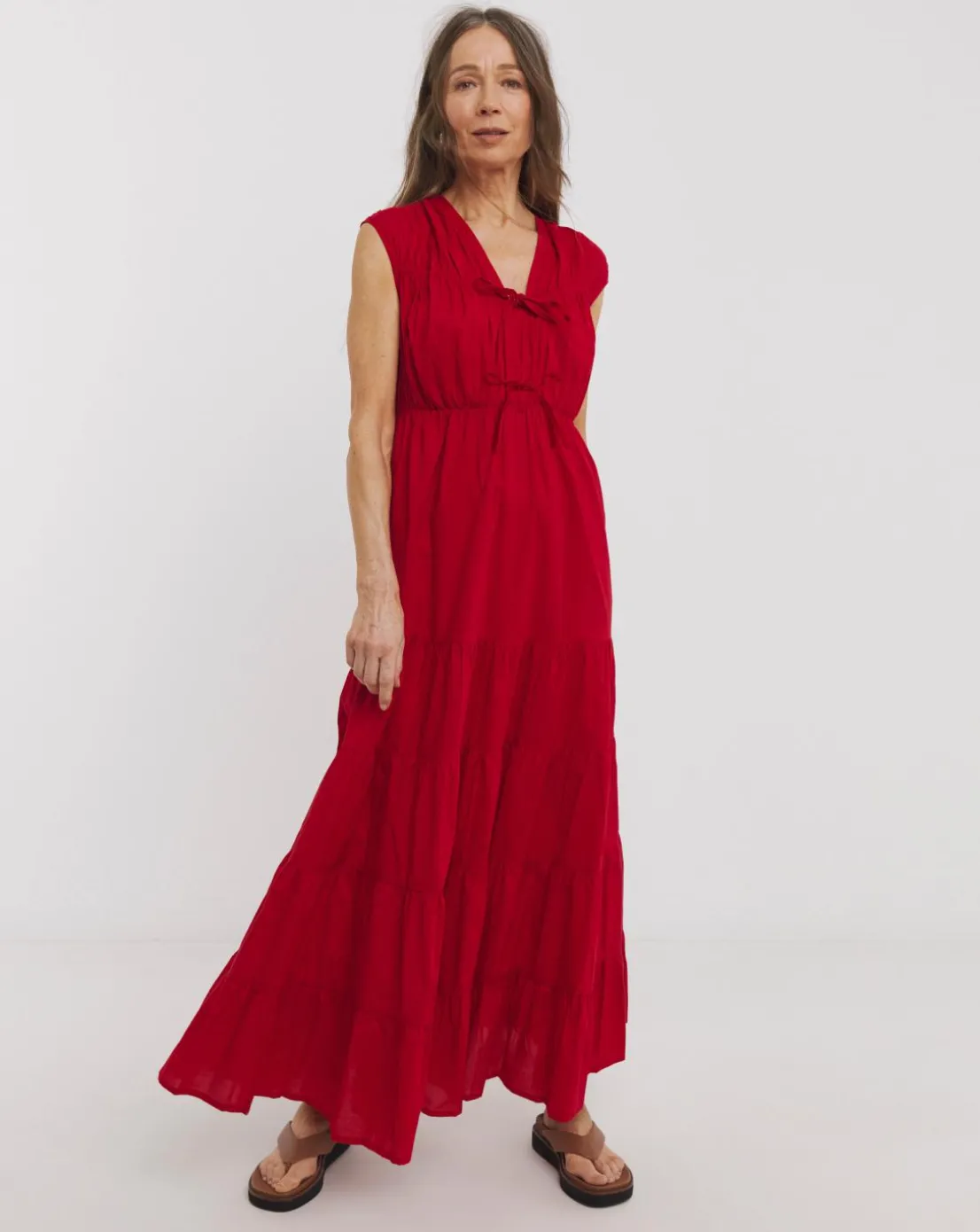 Feel great in this Tie Front Tier Maxi Dress. Designed in a gorgeous red colourway and features a flattering V-neckline, front ties and falls at 52 inches making it the perfect option for the Spring Summer season.