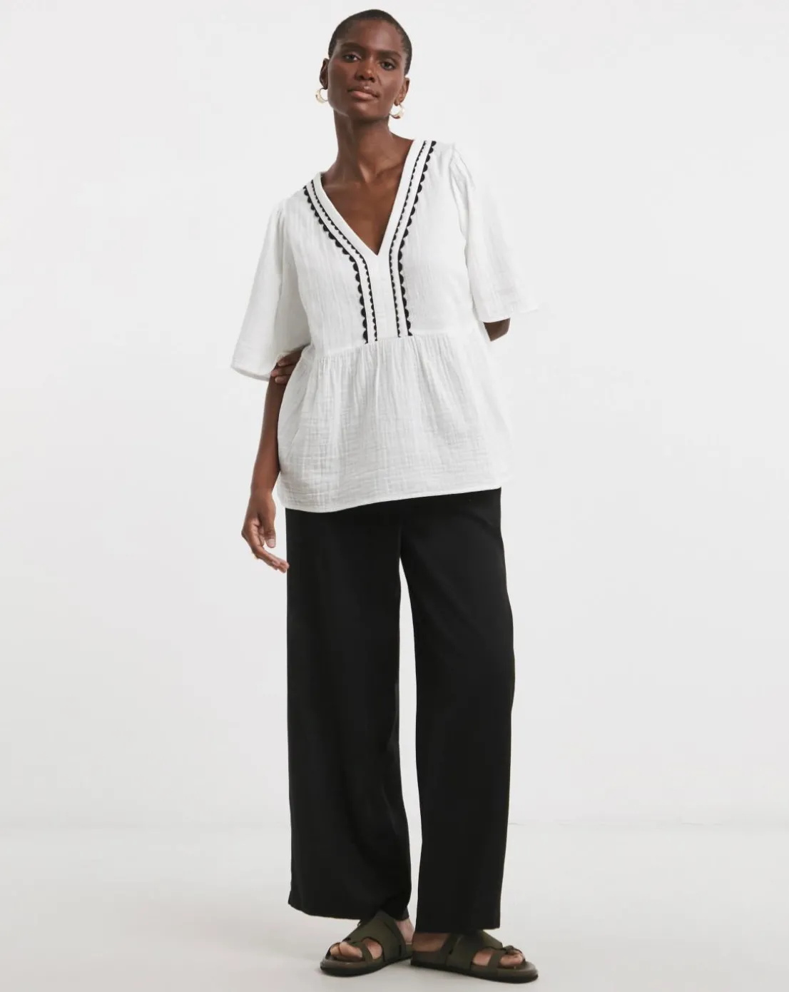 Trim Detail Pure Cotton Textured Short Sleeve Smock Top