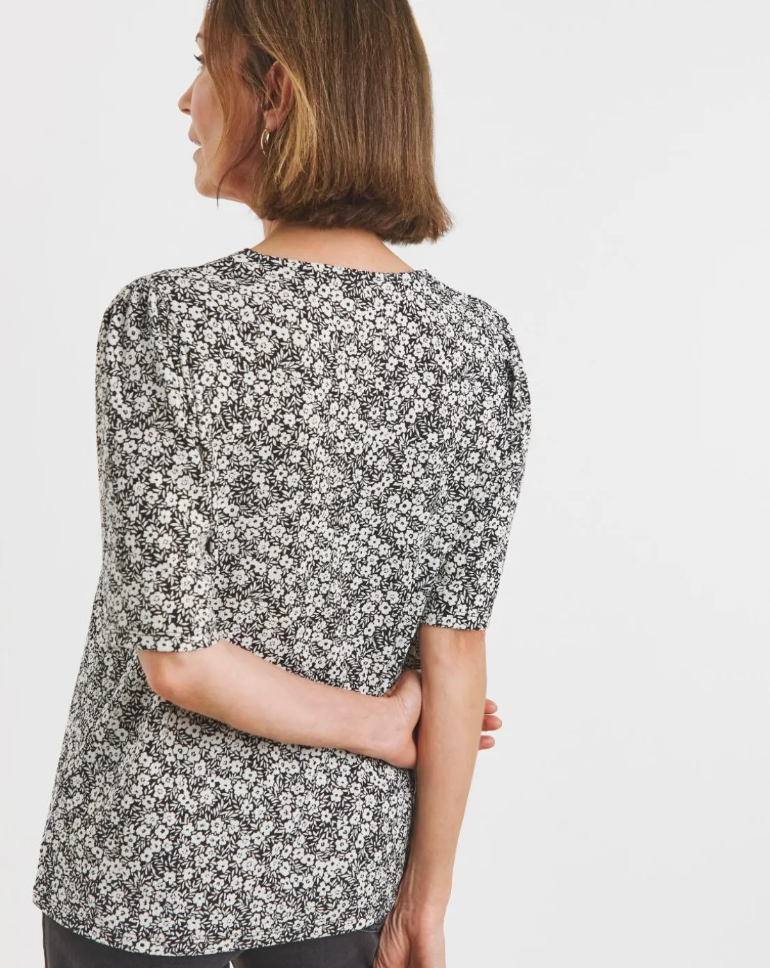 Our puff detail top features a v-neck and short sleeves. Pair with jeans and flats for a trendy look.