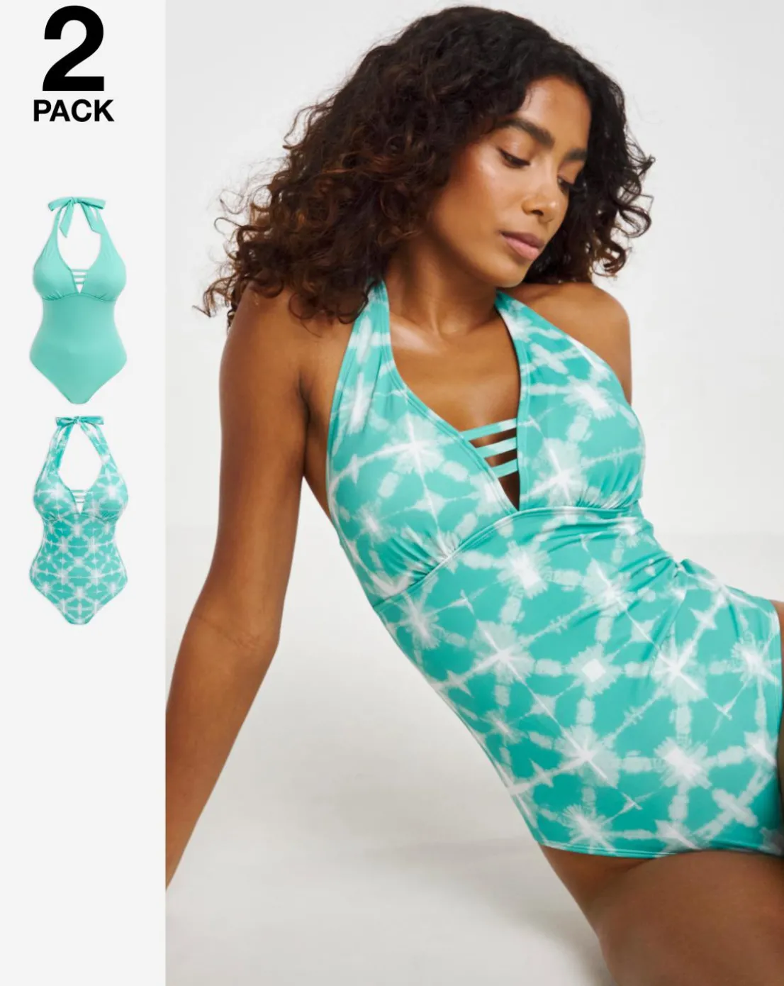 This 2 pack of halterneck swimsuits are perfect for your next summer holiday! In a gorgeous tie dye print and a staple green, featuring a v-neckline with keyhole detail.