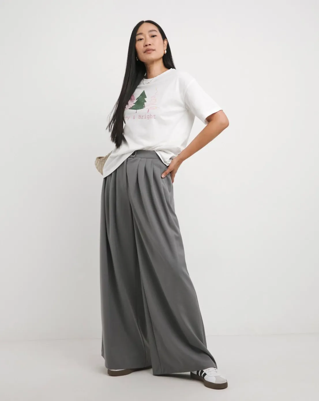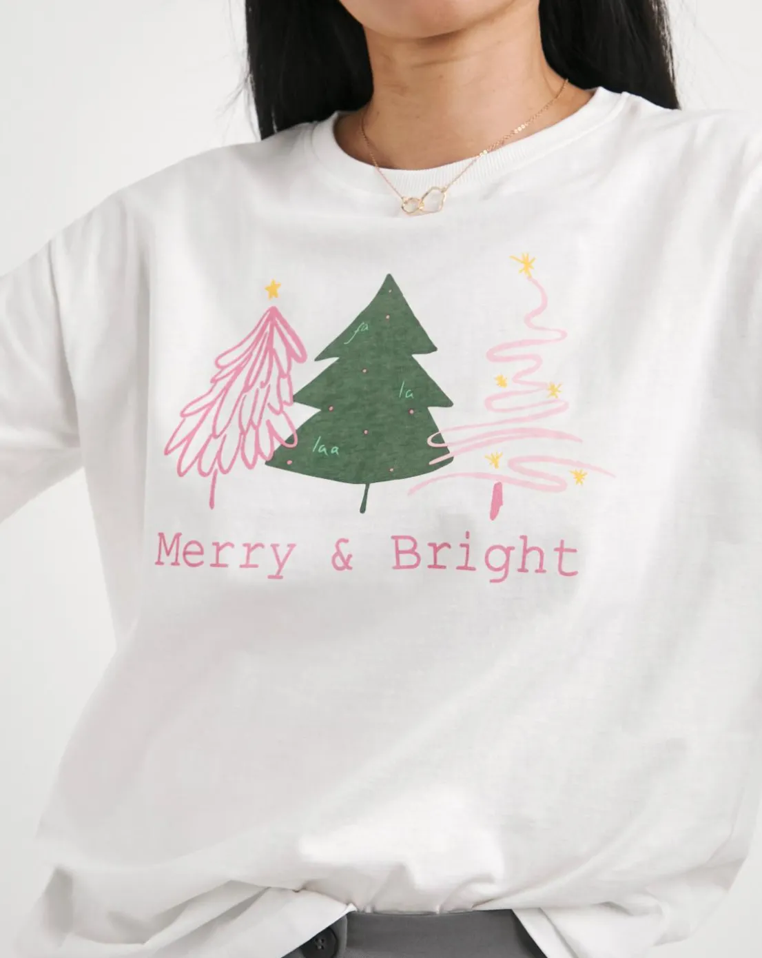 Our merry and bright t-shirt is the perfect addition to your festive wardrobe. Pair with jeans and flats for an everyday look.