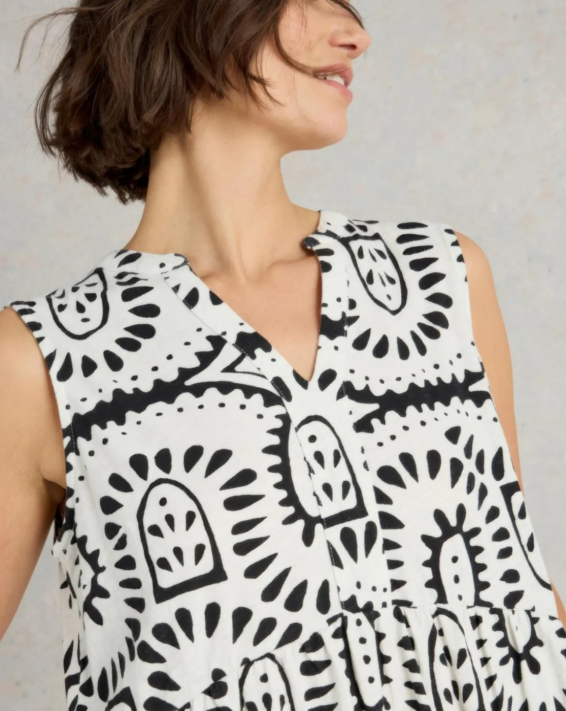 A floaty, sleeveless tunic with a tiered skirt. And a great print all over. (It’s part of our Fairtrade collection, too.) Nice.