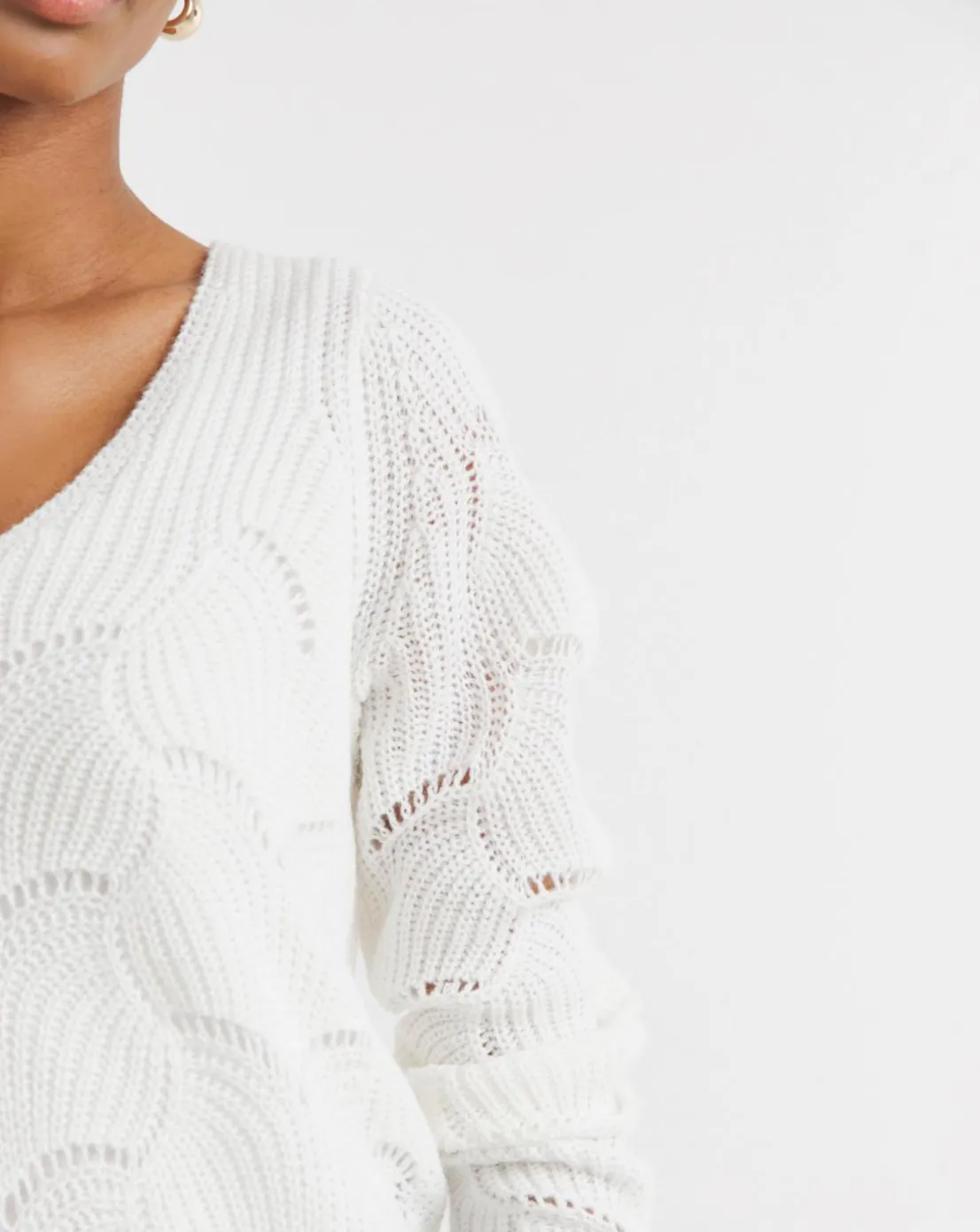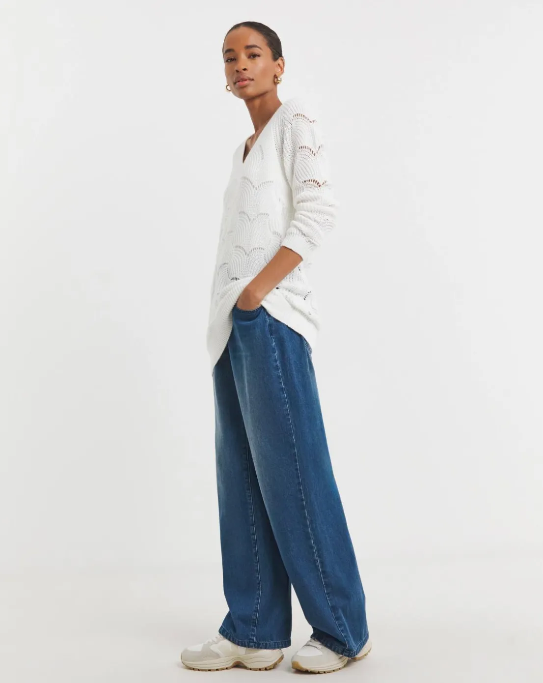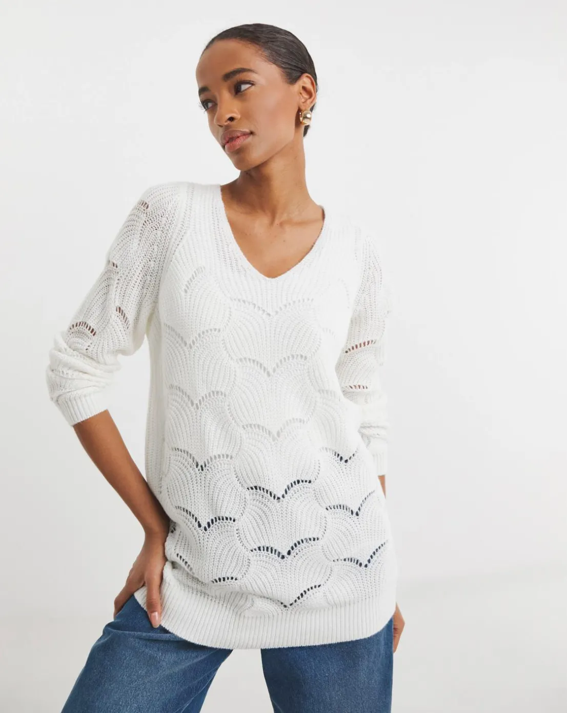 Our tunic in white features open stitch detailing, a flattering v neckline and a relaxed fit.