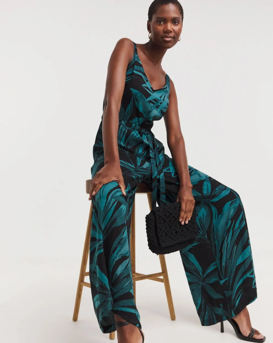 Our new wide leg strappy jumpsuit has been designed in a striking green and blue palm print and a solid black. The jumpsuits features wide flowy legs for comfort, adjustable straps and a belt to cinch in the waist.