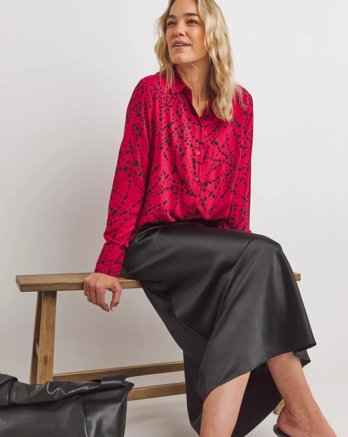Womens Dipped Back Long Sleeve Shirt – Red Abstract