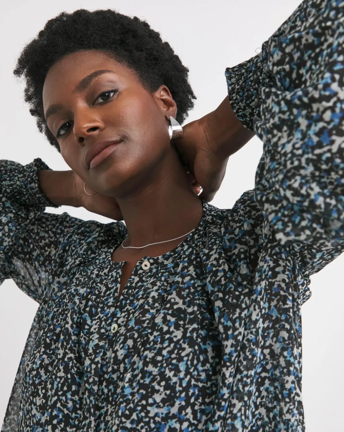 Our georgette blouse is an easy-to-wear, versatile piece, and features a button through design paired with this gorgeous blue abstract print. Suitable for the office with trousers and loafers, or style it with jeans and boots for a cool daytime look.