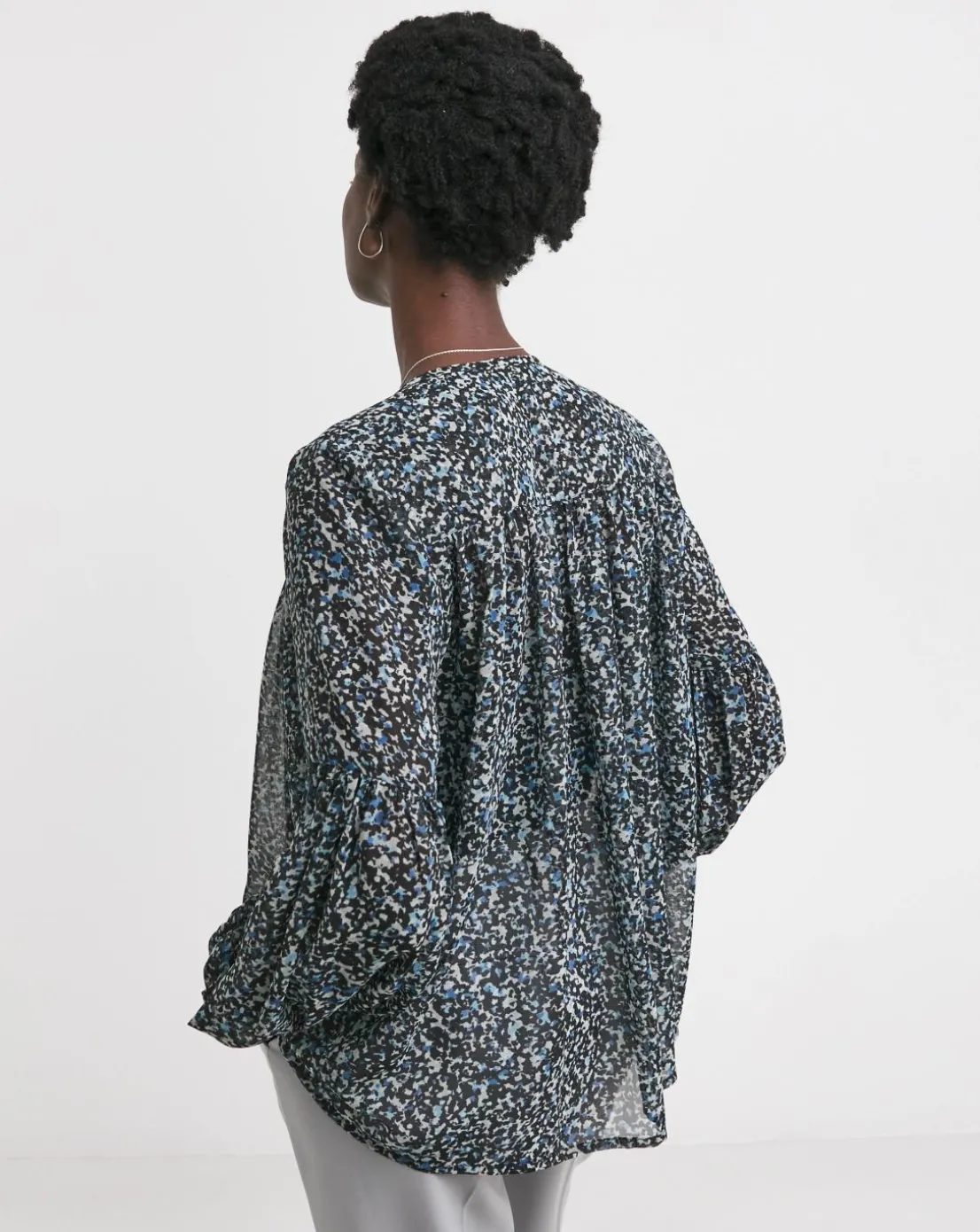 Womens Georgette Collarless Blouson Sleeve – Blue Abstract