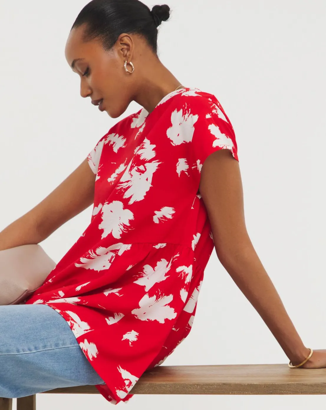 Our smock tee is a firm favourite and we’ve updated it with some new prints for the season, including this bold red floral. Create a laidback look with jeans, trainers and accessories.